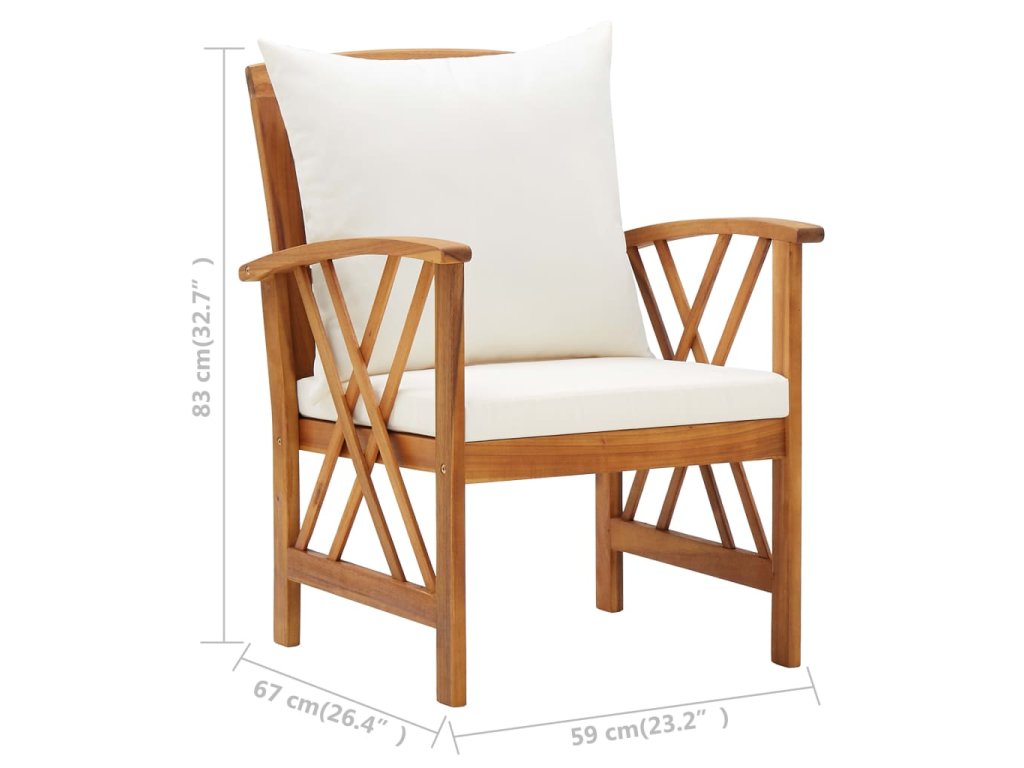 Set zahradního nábytku je zhotovený z masivního akáciového dřeva s olejovou úpravou, je stabilní a má dlouhou životnost. Tlusté podušky na sedák a opěradlo poskytují měkké posezení. Konferenční stolek s masivní dřevěnou stolní deskou s lamelovým designem poslouží jako perfektní odkládací plocha pro vaše občerstvení, mísy s ovocem, dekorativní předměty a další nezbytnosti. Na lavičce a židlích s lehce zaobleným opěradlem a loketními opěrkami se velmi pohodlně sedí.