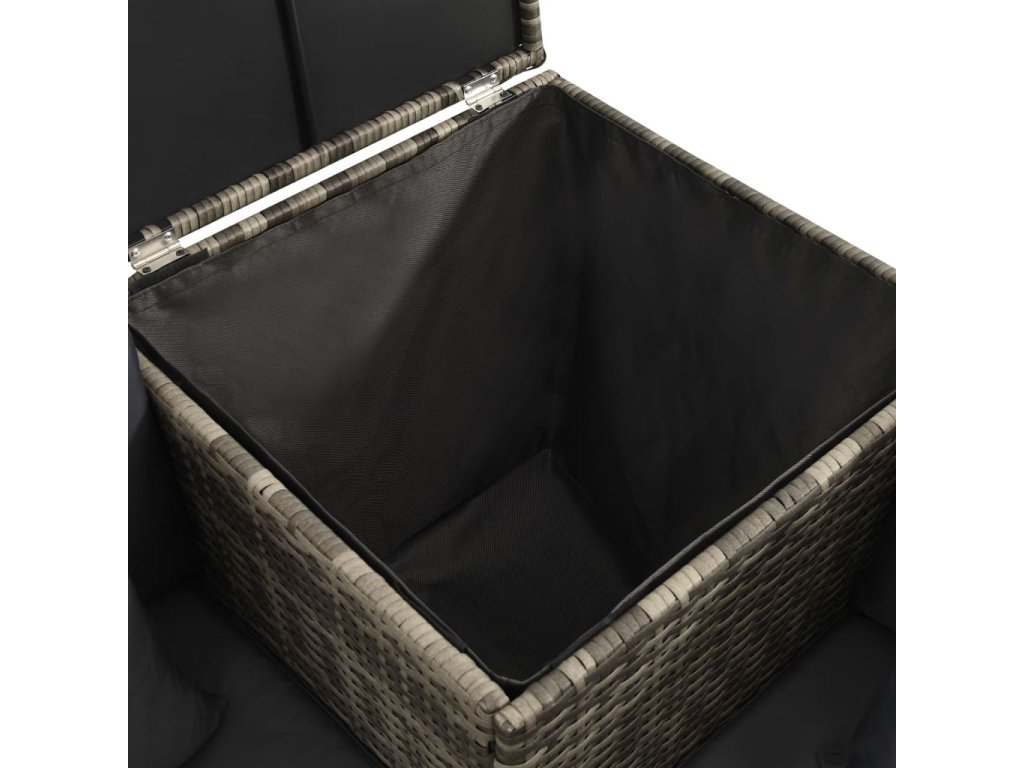 Polyratanová sedací souprava je navržena tak, abyste ji mohli používat na zahradě po celý rok. Díky voděodolnému polyratanu se tento set snadno čistí, je odolný a vhodný pro každodenní použití. Má robustní ocelový rám s práškovým nástřikem, takže je vysoce odolný. Je také lehký a jde snadno přenášet. Úložný box poskytuje prostor pro vaše přikrývky, polštáře, knihy a dalších věci. Silné podušky jsou velmi pohodlné a lze je odejmout. Snadno čistitelné polyesterové potahy se skrytými zipy se dají snadno odstranit a jsou omyvatelné. Skleněná deska stolu je ideální pro servírování nápojů a potravin a také pro vystavení dekorativních předmětů. Tato modulární zahradní sedací souprava z polyratanu je velmi flexibilní a lze ji snadno přemístit, tak aby vyhovovala jakémukoli prostředí!