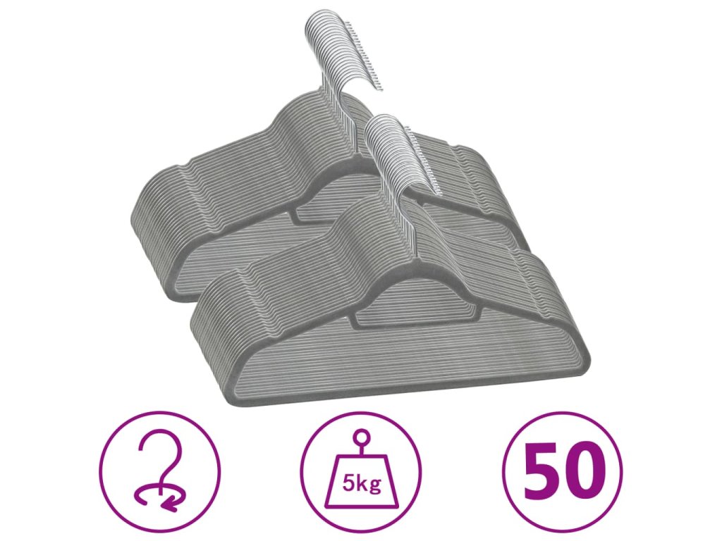 50 ks šatních ramínek protiskluzové šedé samet 289918