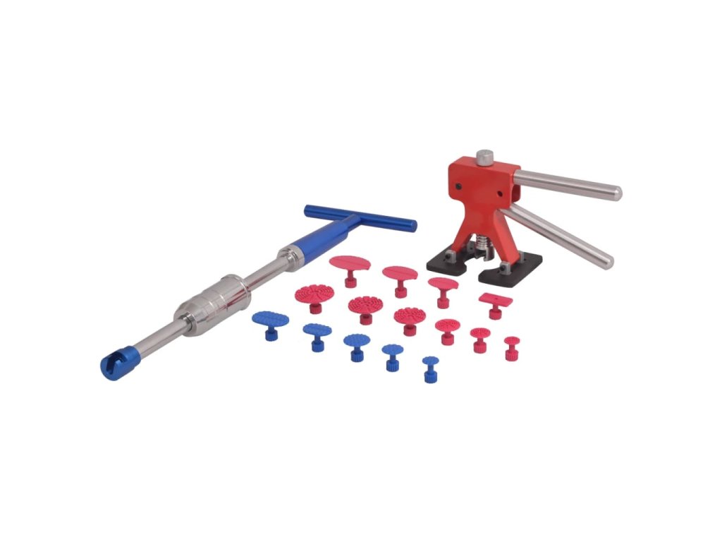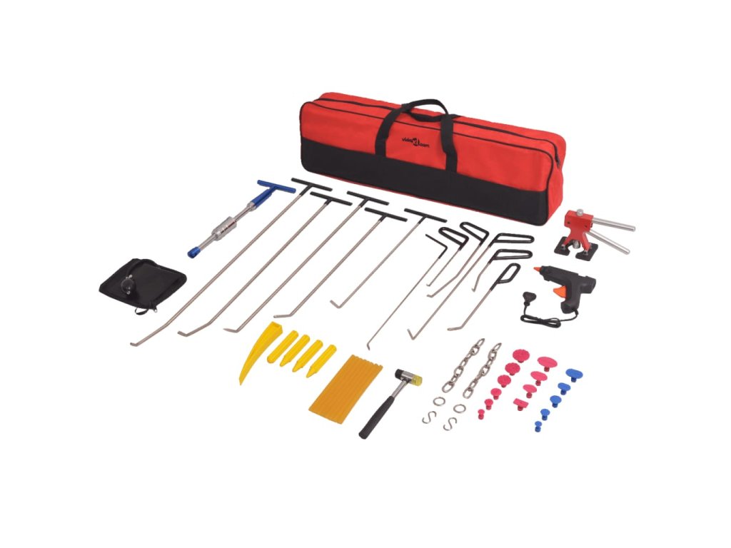 Souprava obsahuje 11 opravných tyčí, 1 vytahovák promáčklin, 1 velké kluzné kladivo ve tvaru T, 5 vyklepávacích per, 25mm kladivo, 8 tyčinek lepidla, 1 klín s pumpičkou, 2 řetězy, 2 S-háky, 2 kroužky a 15 lepicích přísavek. Sada je dodávána v úložném vaku pro snadnou přepravu a skladování.