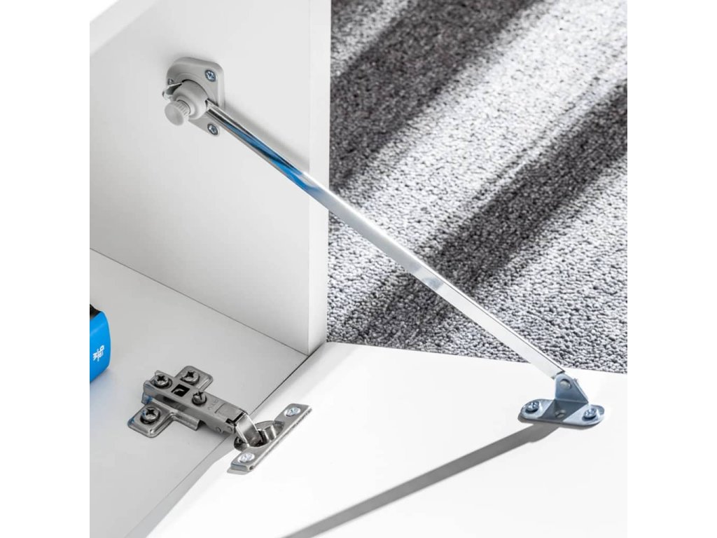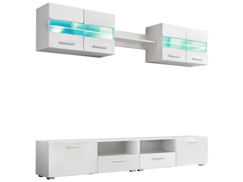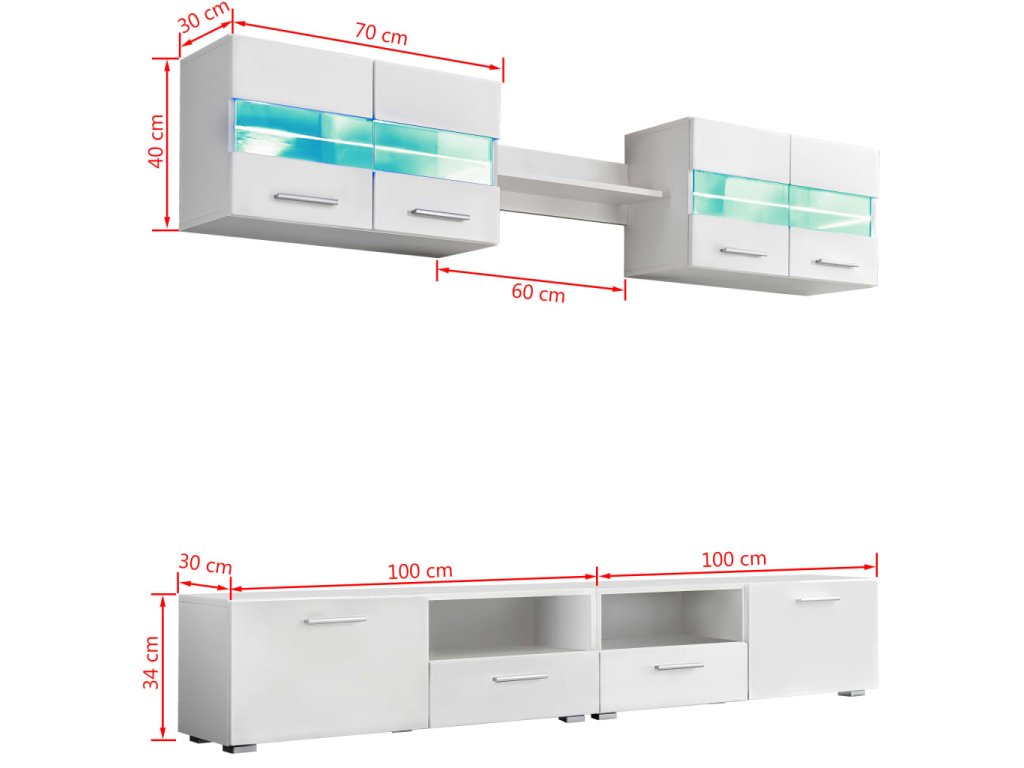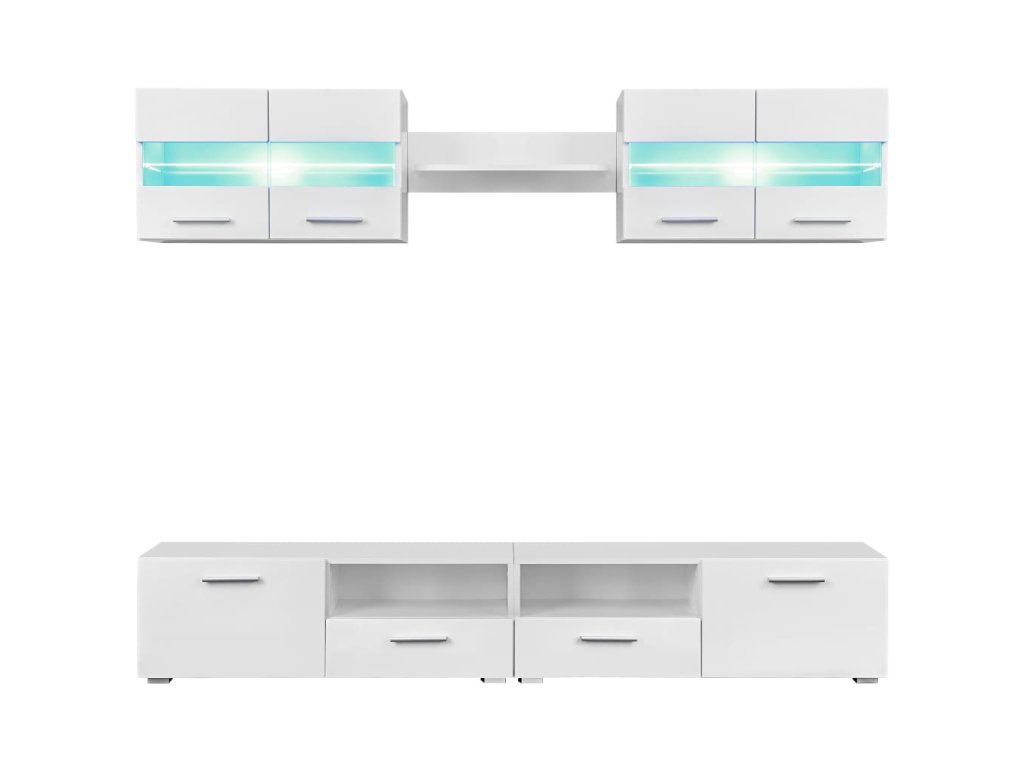 Naše obývací stěna je vyrobena z vysoce kvalitního kompozitního dřeva s vysoce lesklou bílou povrchovou úpravou a má kovové úchytky a nožičky, což jí propůjčuje moderní vzhled, vhodný do každého interiéru. Montáž je snadná. Všimněte si prosím, že TV stolek se skládá ze 2 skříněk.