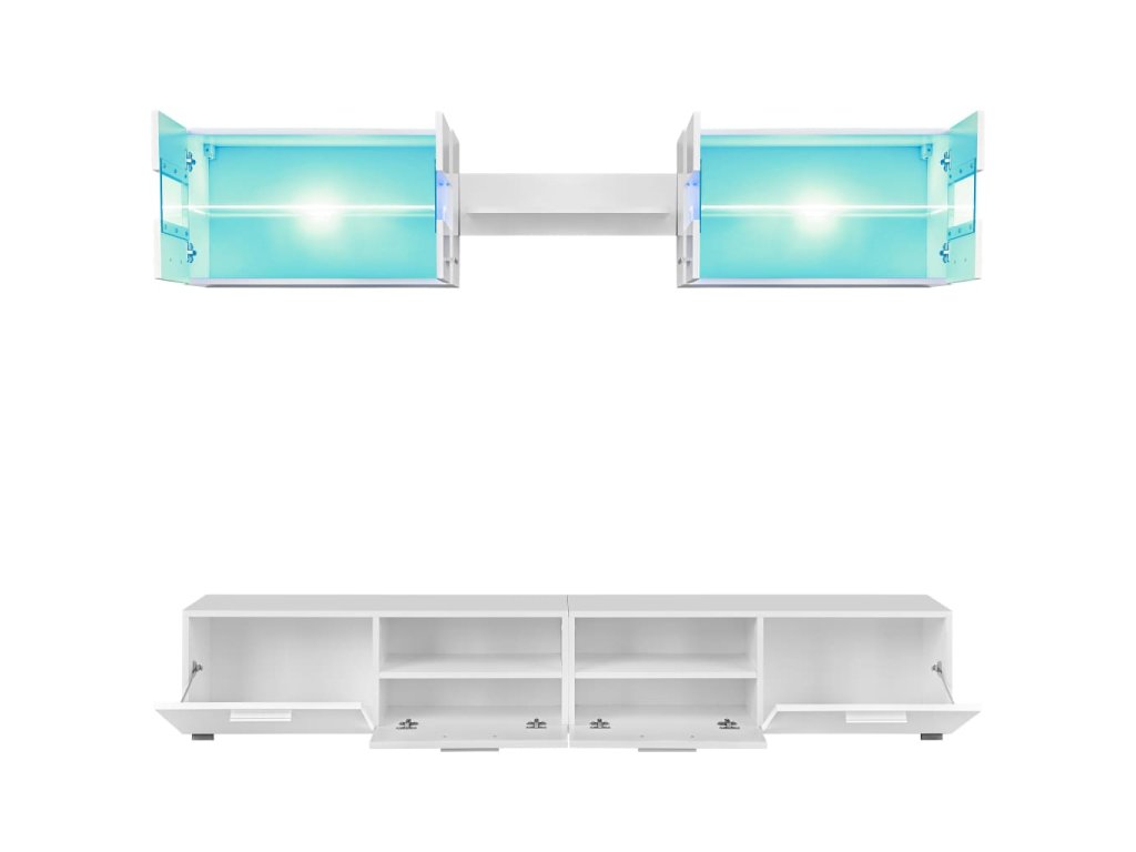 Obývací stěna se dvěma skříňkami, nástěnnou policí a TV stolkem se 2 skříňkami poskytuje dostatek prostoru pro ukládání vašich multimediálních zařízení, DVD přehrávače, mediálních nosičů, knih a různých menších předmětů. Je také vhodná pro vystavení dekorativních předmětů, fotorámečků nebo květin. Každá skříňka má vitrínu, která je vybavena energeticky úsporným LED osvětlením, ideální pro vytvoření příjemné atmosféry. Televizní skřínky mají sklopná dvířka.