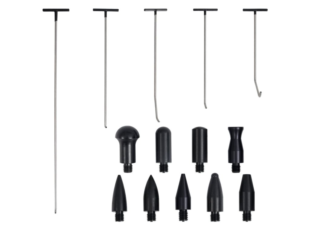 Sada obsahuje 5 pák na opravu a 9 volitelných nástavců na opravu promáčklin bez poškození laku.