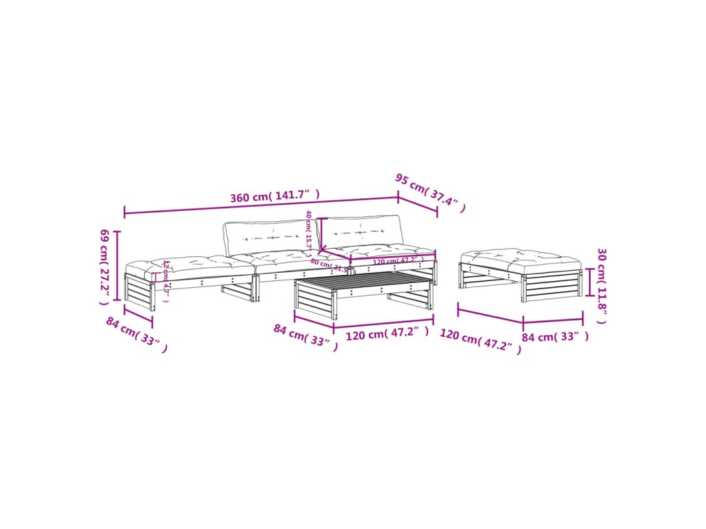 - Rozměry středové pohovky: 120 x 95 x 69 cm (D x Š x V)