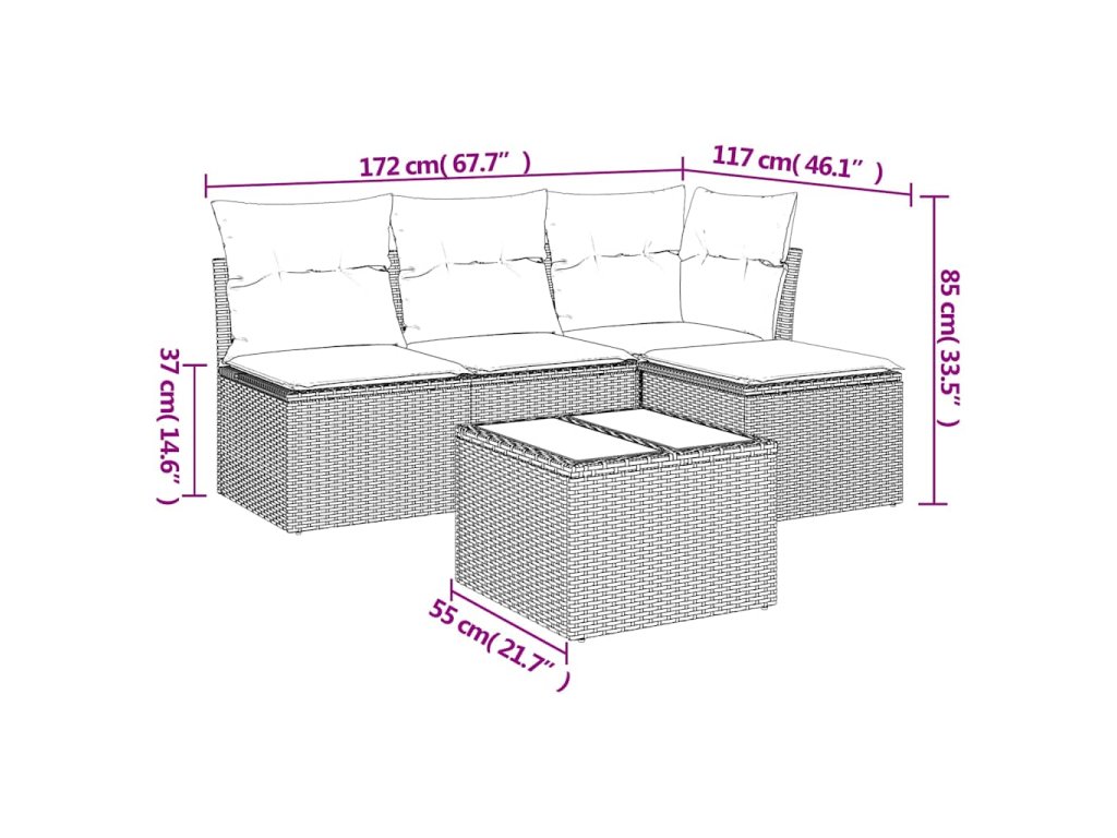 Tato zahradní sedací souprava je dokonalým doplňkem vaší zahrady, terasy nebo dvorku a poskytne vám pohodlné a příjemné místo, kde si můžete povídat s rodinou a přáteli nebo jen tak odpočívat a užívat si pobyt venku.