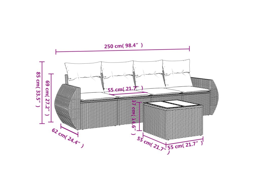 Tato zahradní sedací souprava je dokonalým doplňkem vaší zahrady, terasy nebo dvorku a poskytne vám pohodlné a příjemné místo, kde si můžete povídat s rodinou a přáteli nebo jen tak odpočívat a užívat si pobyt venku.