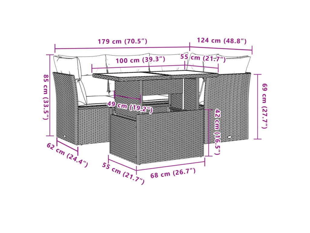 Tato zahradní sedací souprava je dokonalým doplňkem vaší zahrady, terasy nebo dvorku a poskytne vám pohodlné a příjemné místo, kde si můžete povídat s rodinou a přáteli nebo jen tak odpočívat a užívat si pobyt venku.
