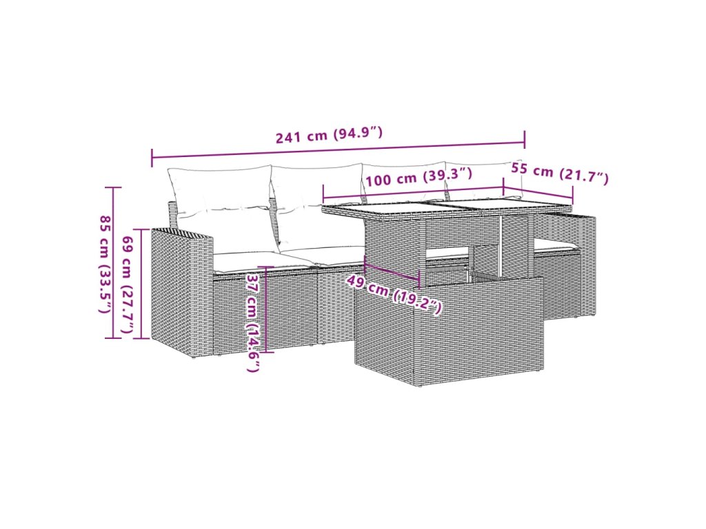 Tato zahradní sedací souprava je dokonalým doplňkem vaší zahrady, terasy nebo dvorku a poskytne vám pohodlné a příjemné místo, kde si můžete povídat s rodinou a přáteli nebo jen tak odpočívat a užívat si pobyt venku.