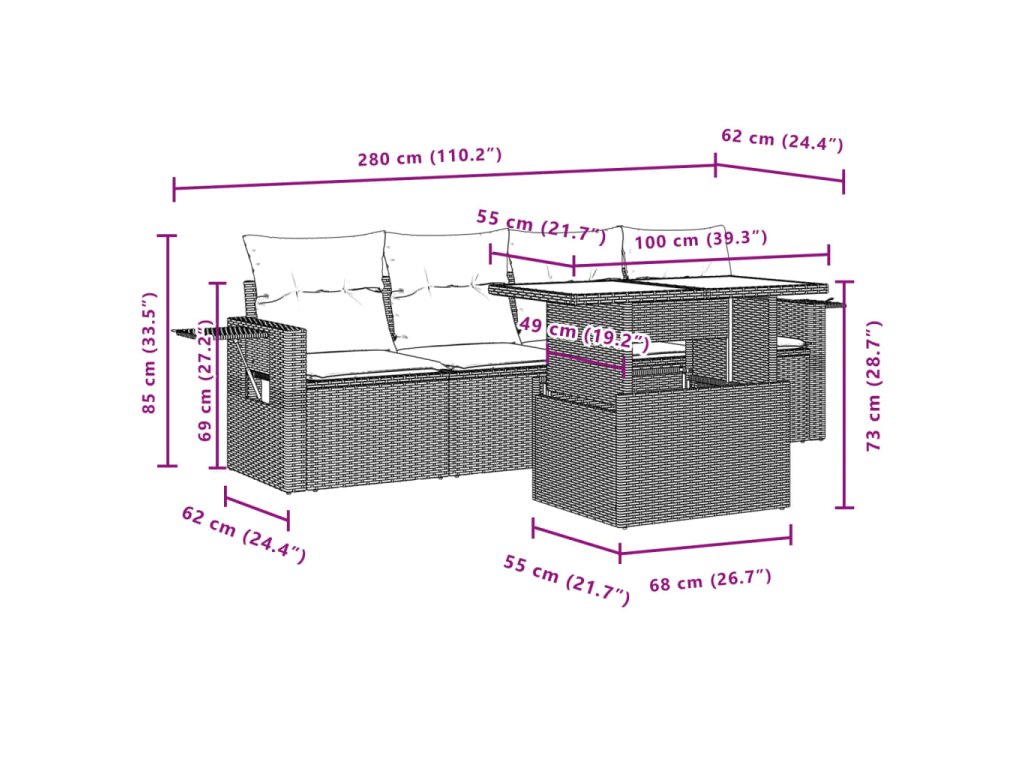 Tato zahradní sedací souprava je dokonalým doplňkem vaší zahrady, terasy nebo dvorku a poskytne vám pohodlné a příjemné místo, kde si můžete povídat s rodinou a přáteli nebo jen tak odpočívat a užívat si pobyt venku.