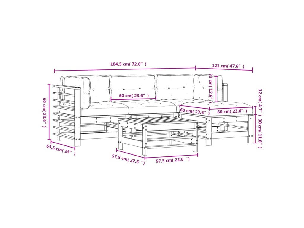 - Rozměry středové pohovky: 57,5 x 63,5 x 60 cm (D x Š x V)