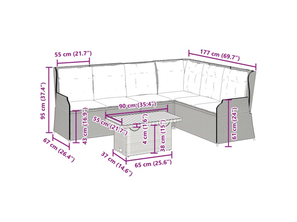 Tato zahradní sedací souprava je dokonalým doplňkem vaší zahrady, terasy nebo dvorku a poskytne vám pohodlné a příjemné místo, kde si můžete povídat s rodinou a přáteli nebo jen tak odpočívat a užívat si pobyt venku.