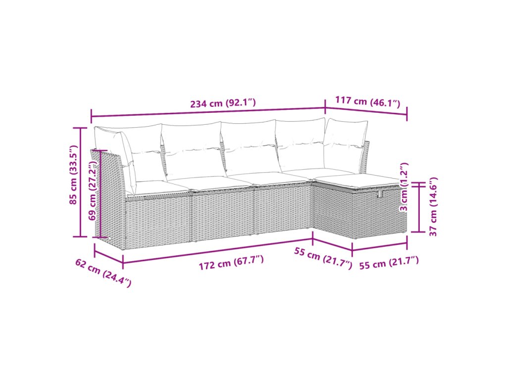 Tato zahradní sedací souprava je dokonalým doplňkem vaší zahrady, terasy nebo dvorku a poskytne vám pohodlné a příjemné místo, kde si můžete povídat s rodinou a přáteli nebo jen tak odpočívat a užívat si pobyt venku.