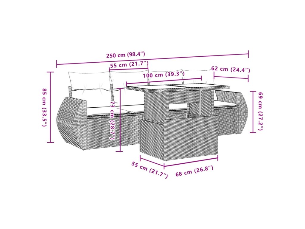 Tato zahradní sedací souprava je dokonalým doplňkem vaší zahrady, terasy nebo dvorku a poskytne vám pohodlné a příjemné místo, kde si můžete povídat s rodinou a přáteli nebo jen tak odpočívat a užívat si pobyt venku.