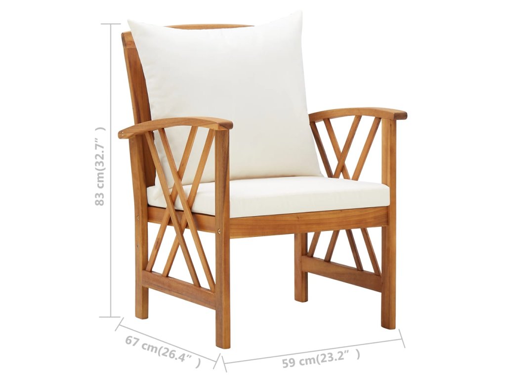 Set zahradního nábytku je zhotovený z masivního akáciového dřeva s olejovou úpravou, je stabilní a má dlouhou životnost. Tlusté podušky na sedák a opěradlo poskytují měkké posezení. Konferenční stolek s masivní dřevěnou stolní deskou s lamelovým designem poslouží jako perfektní odkládací plocha pro vaše občerstvení, mísy s ovocem, dekorativní předměty a další nezbytnosti. Na židlích s lehce zaobleným opěradlem a loketními opěrkami se velmi pohodlně sedí.