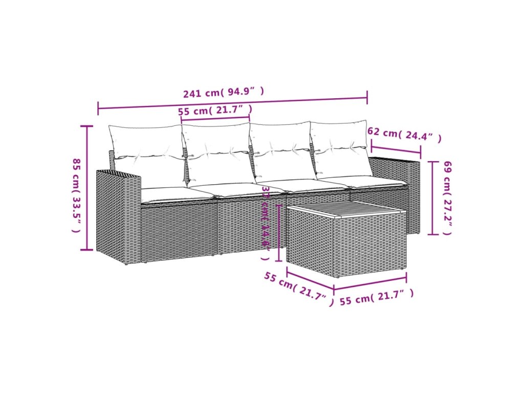 Tato zahradní sedací souprava je dokonalým doplňkem vaší zahrady, terasy nebo dvorku a poskytne vám pohodlné a příjemné místo, kde si můžete povídat s rodinou a přáteli nebo jen tak odpočívat a užívat si pobyt venku.