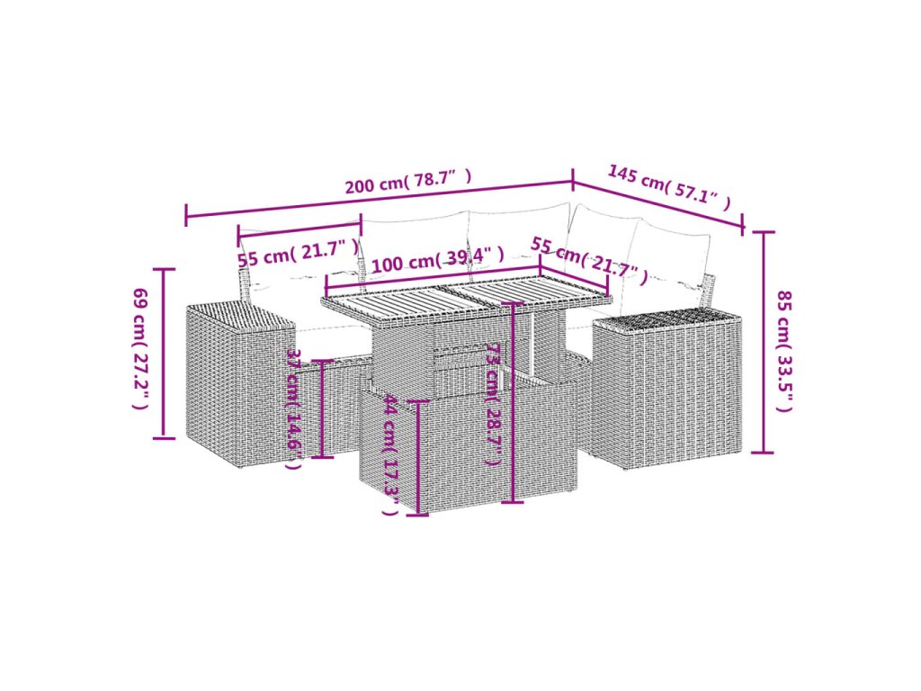 Tato zahradní sedací souprava je dokonalým doplňkem vaší zahrady, terasy nebo dvorku a poskytne vám pohodlné a příjemné místo, kde si můžete povídat s rodinou a přáteli nebo jen tak odpočívat a užívat si pobyt venku.