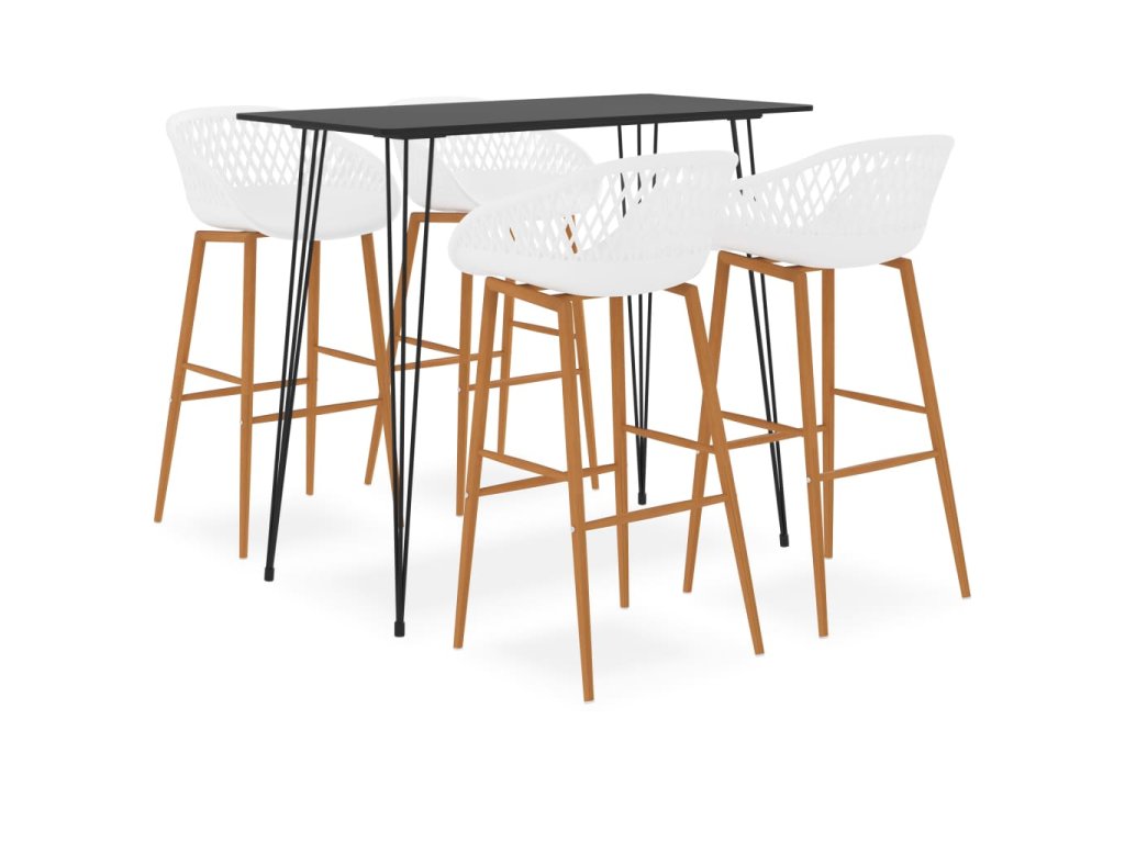 Stolní deska je zhotovená z MDF, takže se snadno čistí. Práškově lakovaný kovový rám přispívá k celkové stabilitě a odolnosti barového stolu. Barové stoličky mají ergonomicky tvarované sedáky s integrovaným nízkým opěradlem v síťovaném provedení. Jelikož jsou vyrobené z robustního PP a podepírají je pevné kovové nohy s termotransferovým potiskem v imitaci dřeva, jsou mimořádně bytelné a dlouho vám vydrží.