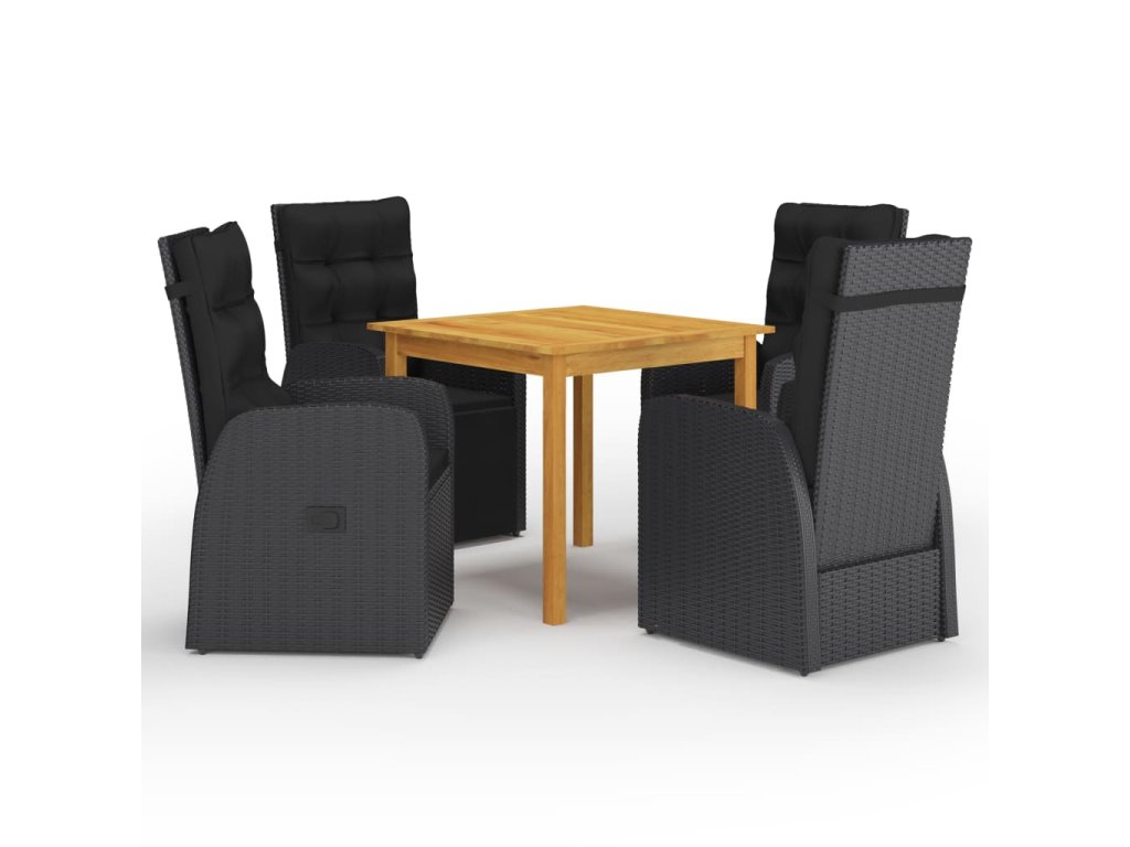 Jídelní stůl je zhotovený z masivního akáciového dřeva s olejovaným povrchem, takže je stabilní, odolný a nenáročný na údržbu. Bytelné jídelní židle mají rám z práškově lakované oceli, opletený PE ratanem, který výborně vzdoruje klimatickým vlivům a snadno se čistí. S polohovatelným opěradlem a opěrkou nohou vám nic nebude bránit v příjemném odpočinku. Opěradlo lze sklopit zatažením za tlačítko na boku. Židle mají lehkou konstrukci, není tedy problém je přesunout, kam potřebujete. Navíc jsou opatřené mimořádně pohodlnými, hustě polstrovanými poduškami pro maximální komfort. Jejich polyesterové potahy nevyžadují téměř žádnou údržbu a dají se stáhnout a vyprat.