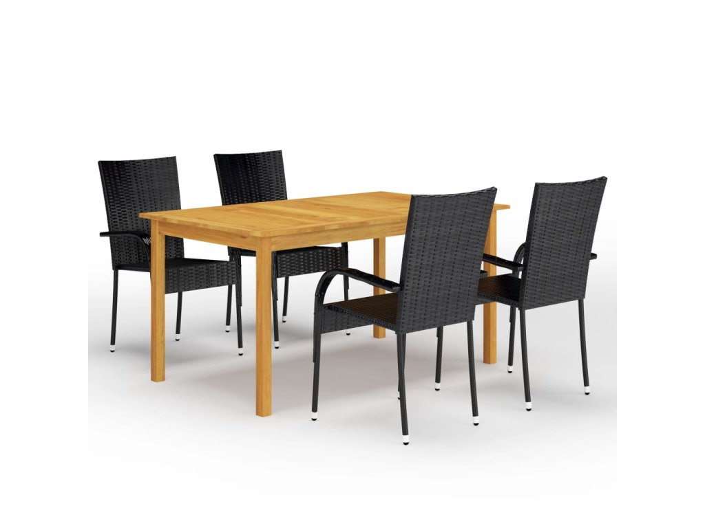 Jídelní stůl je zhotovený z masivního akáciového dřeva s olejovaným povrchem, takže je stabilní, odolný a nenáročný na údržbu. Zahradní židle mají rám z práškově lakované oceli, opletený PE ratanem, který výborně vzdoruje klimatickým vlivům. Dlouho vám proto vydrží a snadno je očistíte. Jídelní židle mají také lehkou konstrukci a lze je stohovat, aby vám zbytečně nepřekážely, když je zrovna nepoužíváte.
