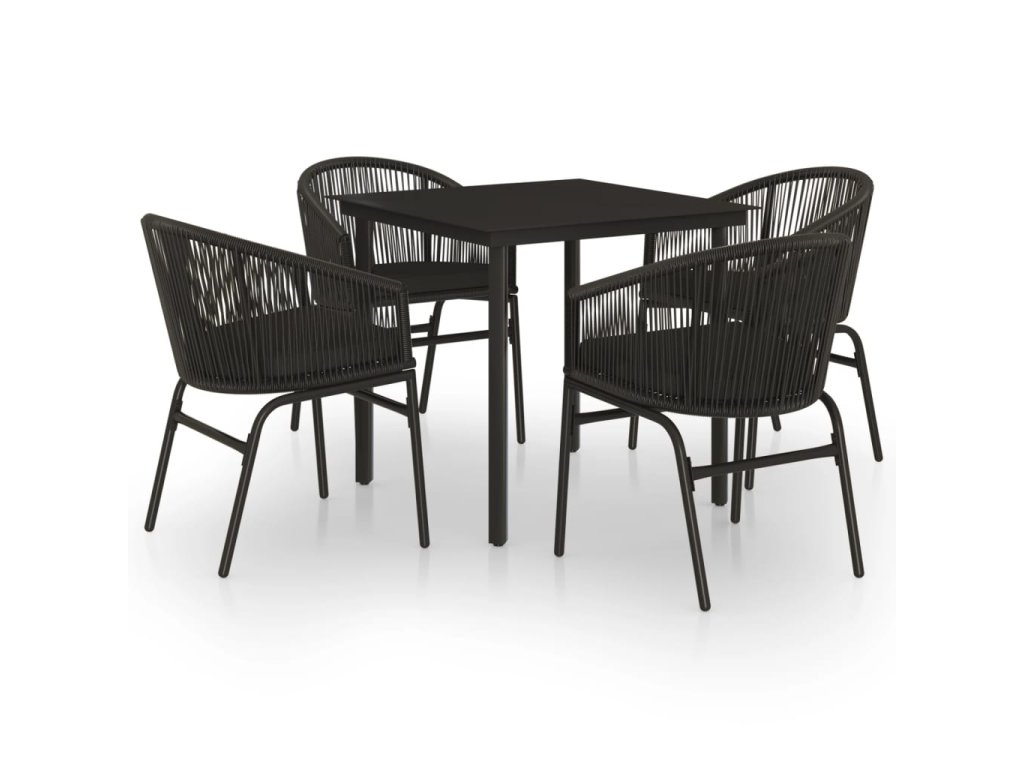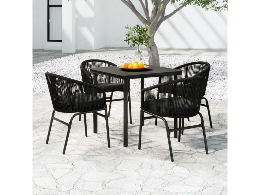 Zahradní jídelní set má práškově lakovaný ocelový rám, takže je robustní a stabilní a ideální pro venkovní použití. Hladká skleněná deska stolu se snadno čistí vlhkým hadříkem a skvěle vám poslouží k podávání jídla a pití nebo k vystavení různých dekorativních předmětů. Židle jsou vyrobené z PVC ratanu, jsou proto odolné a výborně vzdorují UV záření i špatnému počasí. Každá z nich je navíc opatřená odnímatelnou hustě polstrovanou poduškou, a zpříjemní vám tak váš odpočinek.