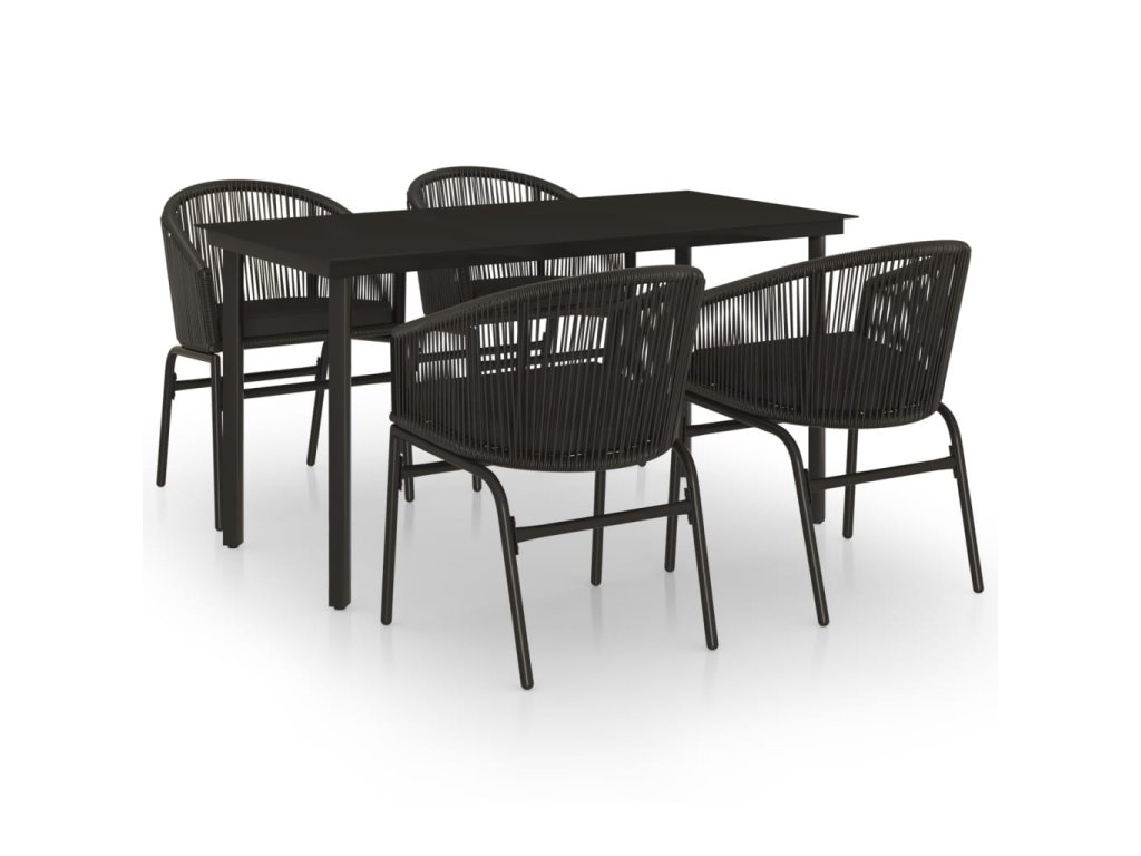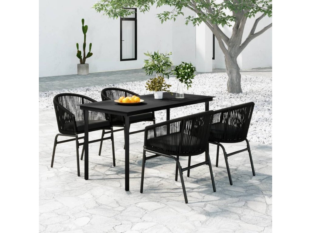 Zahradní jídelní set má práškově lakovaný ocelový rám, takže je robustní a stabilní a ideální pro venkovní použití. Hladká skleněná deska stolu se snadno čistí vlhkým hadříkem a skvěle vám poslouží k podávání jídla a pití nebo k vystavení různých dekorativních předmětů. Židle jsou vyrobené z PVC ratanu, jsou proto odolné a výborně vzdorují UV záření i špatnému počasí. Každá z nich je navíc opatřená odnímatelnou hustě polstrovanou poduškou, a zpříjemní vám tak váš odpočinek.