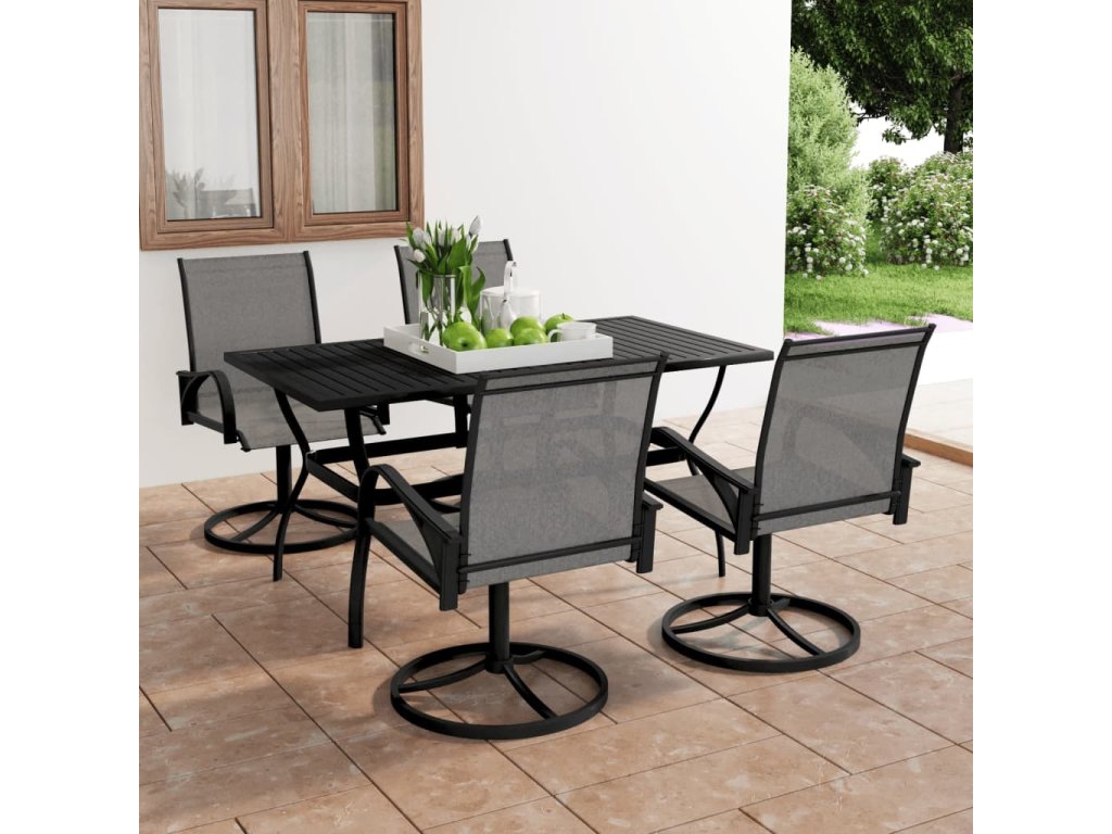 Tento zahradní stůl s laťkovým designem je vyrobený z práškově lakované oceli, takže je robustní a stabilní. Jídelní židle má konstrukci z práškově lakované oceli, která je korozivzdorná a klimaticky odolná, a sedák z prodyšné a rychleschnoucí textilní tkaniny, aby dobře odvětrával. 360° otočná kulatá základna, ergonomická podpora zad a zaoblené područky vám poskytnou lepší uživatelský komfort a pohodlí při posezení na zahradě.