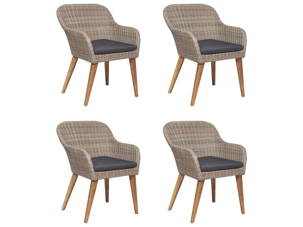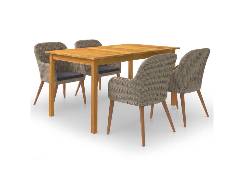 Jídelní stůl je zhotovený z masivního akáciového dřeva s olejovaným povrchem, takže je stabilní, odolný a nenáročný na údržbu. Jídelní židle mají rám z práškově lakované oceli, opletený PE ratanem, který výborně vzdoruje klimatickým vlivům. Dlouho vám proto vydrží a snadno je očistíte. Ergonomický tvar spolu s hustě polstrovanými poduškami vám při sezení zaručí maximální pohodlí. Polyesterové potahy podušek nevyžadují téměř žádnou údržbu a dají se jednoduše stáhnout a oprat.