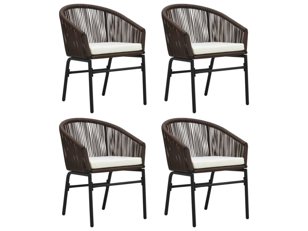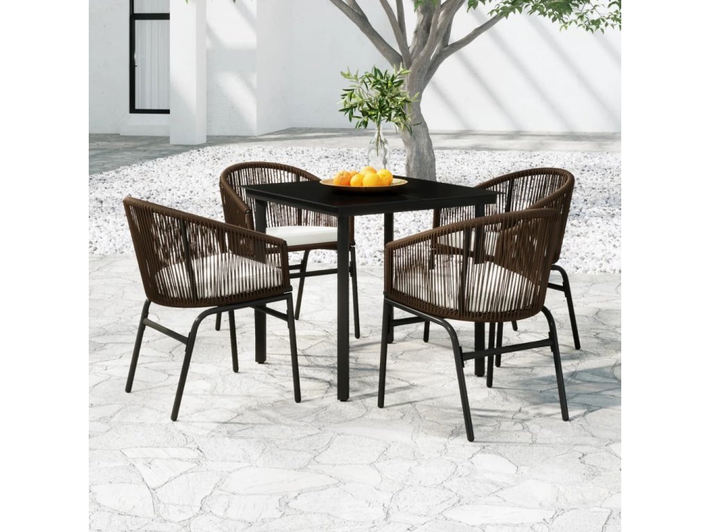 Zahradní jídelní set má práškově lakovaný ocelový rám, takže je robustní a stabilní a ideální pro venkovní použití. Hladká skleněná deska stolu se snadno čistí vlhkým hadříkem a skvěle vám poslouží k podávání jídla a pití nebo k vystavení různých dekorativních předmětů. Židle jsou vyrobené z PVC ratanu, jsou proto odolné a výborně vzdorují UV záření i špatnému počasí. Každá z nich je navíc opatřená odnímatelnou hustě polstrovanou poduškou, a zpříjemní vám tak váš odpočinek.