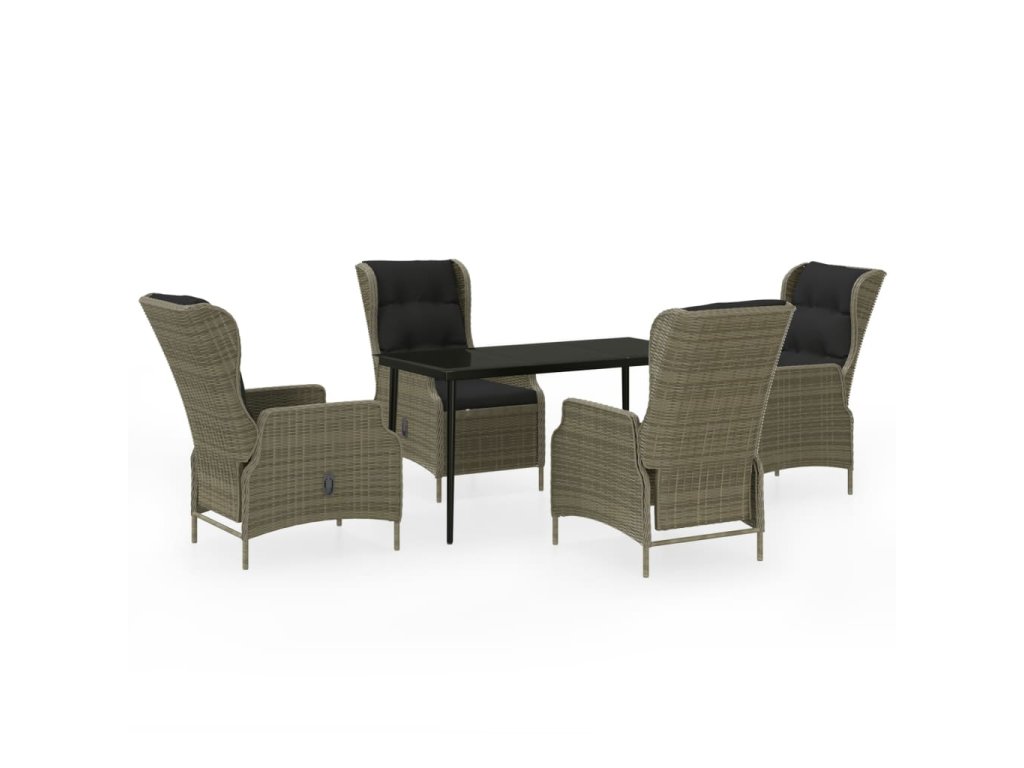 Praktický zahradní jídelní set má ocelový rám, takže je pevný a má dlouhou životnost. Polohovací židle jsou vyrobené z voděodolného PE ratanu, který nevyžaduje žádnou údržbu, hodí se proto skvěle k venkovnímu použití. Hustě polstrované podušky vám při stolování poskytnou maximální pohodlí. Potah podušky je opatřený zipem, lze ho tedy stáhnout a vyprat. Pomocí mechanismu s plynovým pístem si navíc snadno přizpůsobíte opěradlo křesla podle vlastních potřeb. Stisknutím tlačítka na boku ho sklopíte do té nejpohodlnější pozice. Hladká skleněná stolní deska, kterou jednoduše očistíte vlhkým hadříkem, je ideální k podávání jídla a pití nebo k vystavování různých dekorativních předmětů.