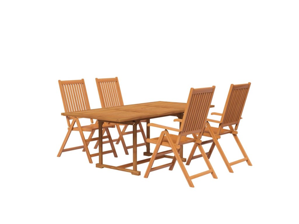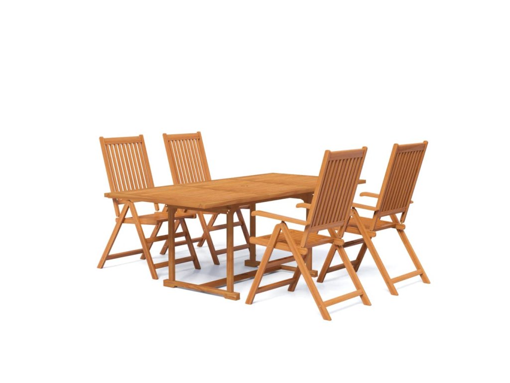 - Prvotřídní materiál: Zahradní jídelní set je vyrobený z masivní akácie, což je tropické tvrdé dřevo, které je odolné a výborně vzdoruje povětrnostním vlivům, takže vám vydrží sloužit po dlouhá léta. Olejovaný povrch se navíc snadno čistí vlhkým hadříkem.