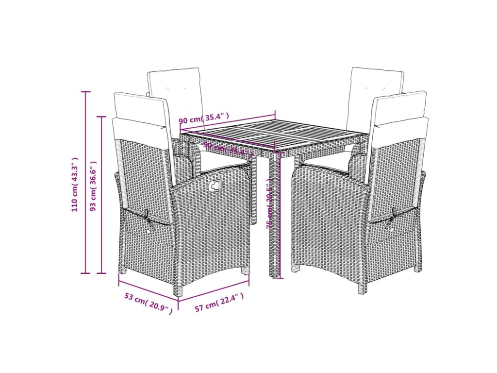 - Materiál: PE ratan, práškově lakovaná ocel, masivní akáciové dřevo s olejovou povrchovou úpravou