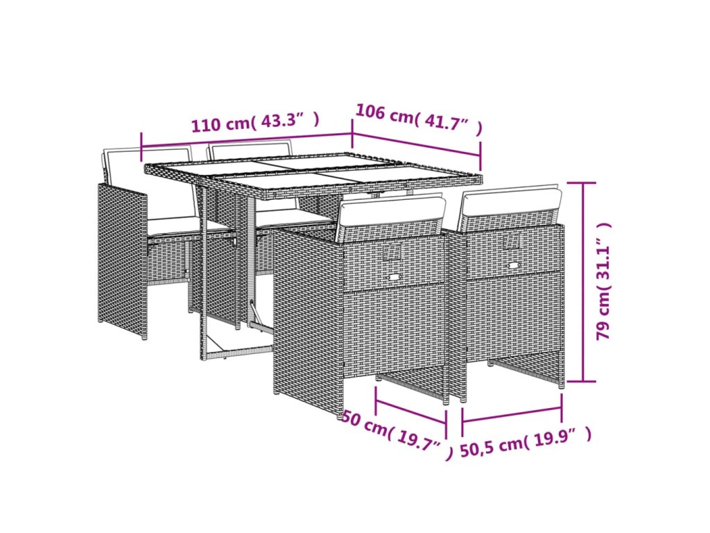 - Materiál: PE ratan, práškově lakovaná ocel, masivní akáciové dřevo s olejovou povrchovou úpravou