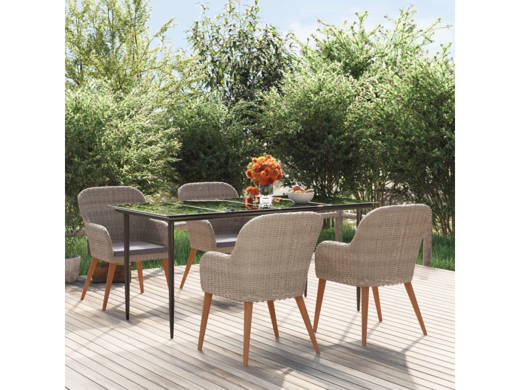 - Materiál: polyratan, práškově lakovaná ocel, masivní akáciové dřevo s olejovou povrchovou úpravou