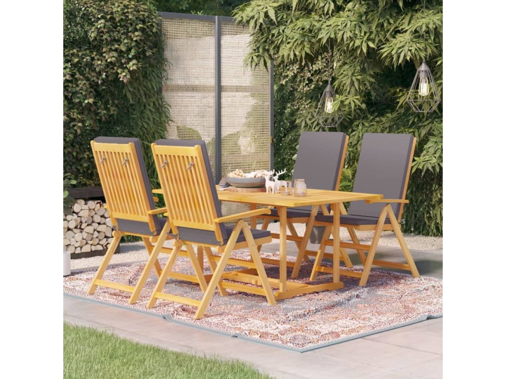 Nábytkový sestava má překrásnou povrchovou úpravu, která dřevu dodává hřejivý odstín. Ve stolu se nachází otvor na slunečník, abyste se mohli chránit před sluncem. Opěradla židlí lze nastavit do 5 poloh, takže vám nic nebrání najít si tu nejpohodlnější pozici. Židle mají navíc skládací design, aby vám zbytečně nepřekážely, když je zrovna nepoužíváte. Lehká konstrukce usnadňuje jejich přesouvání. Hustě polstrované podušky přispívají k ještě většímu pohodlí a mají snímatelné potahy pro jednodušší praní. Celá sada nábytku vám poskytne maximální komfort a zpříjemní vám čas strávený s vaší rodinou a přáteli. K očištění vám přitom postačí navlhčený hadřík.