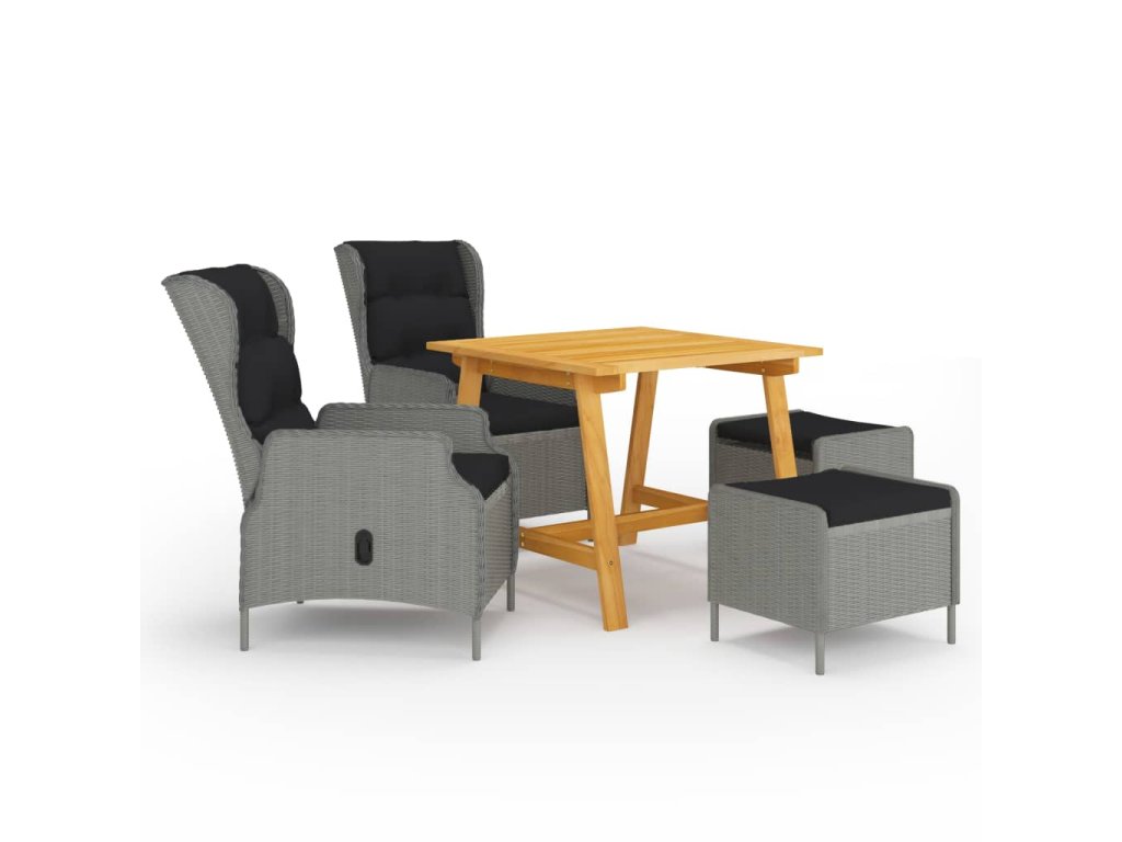 Jídelní stůl je zhotovený z masivního akáciového dřeva s olejovaným povrchem, takže je stabilní, odolný a nenáročný na údržbu. Zahradní židle a stolička mají rám z práškově lakované oceli, opletený kulatým PE ratanem, dlouho vám proto vydrží a snadno je očistíte. Hustě polstrované podušky vám při odpočinku zaručí mimořádný komfort. Jejich potahy jsou opatřené zipem, abyste je mohli bez námahy stáhnout a oprat. Židle disponují mechanismem s plynovým pístem, umožní vám tedy také nastavit opěradlo do různých poloh. Stačí stisknout tlačítko na boku a opěradlo se sklopí do pohodlné pozice vleže. Vzhledem k lehké konstrukci lze jídelní židle i stoličku jednoduše přesouvat, kam potřebujete.