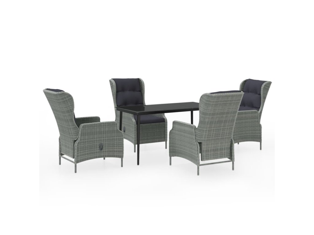 Praktický zahradní jídelní set má ocelový rám, takže je pevný a má dlouhou životnost. Polohovací židle jsou vyrobené z voděodolného PE ratanu, který nevyžaduje žádnou údržbu, hodí se proto skvěle k venkovnímu použití. Hustě polstrované podušky vám při stolování poskytnou maximální pohodlí. Potah podušky je opatřený zipem, lze ho tedy stáhnout a vyprat. Pomocí mechanismu s plynovým pístem si navíc snadno přizpůsobíte opěradlo křesla podle vlastních potřeb. Stisknutím tlačítka na boku ho sklopíte do té nejpohodlnější pozice. Hladká skleněná stolní deska, kterou jednoduše očistíte vlhkým hadříkem, je ideální k podávání jídla a pití nebo k vystavování různých dekorativních předmětů.