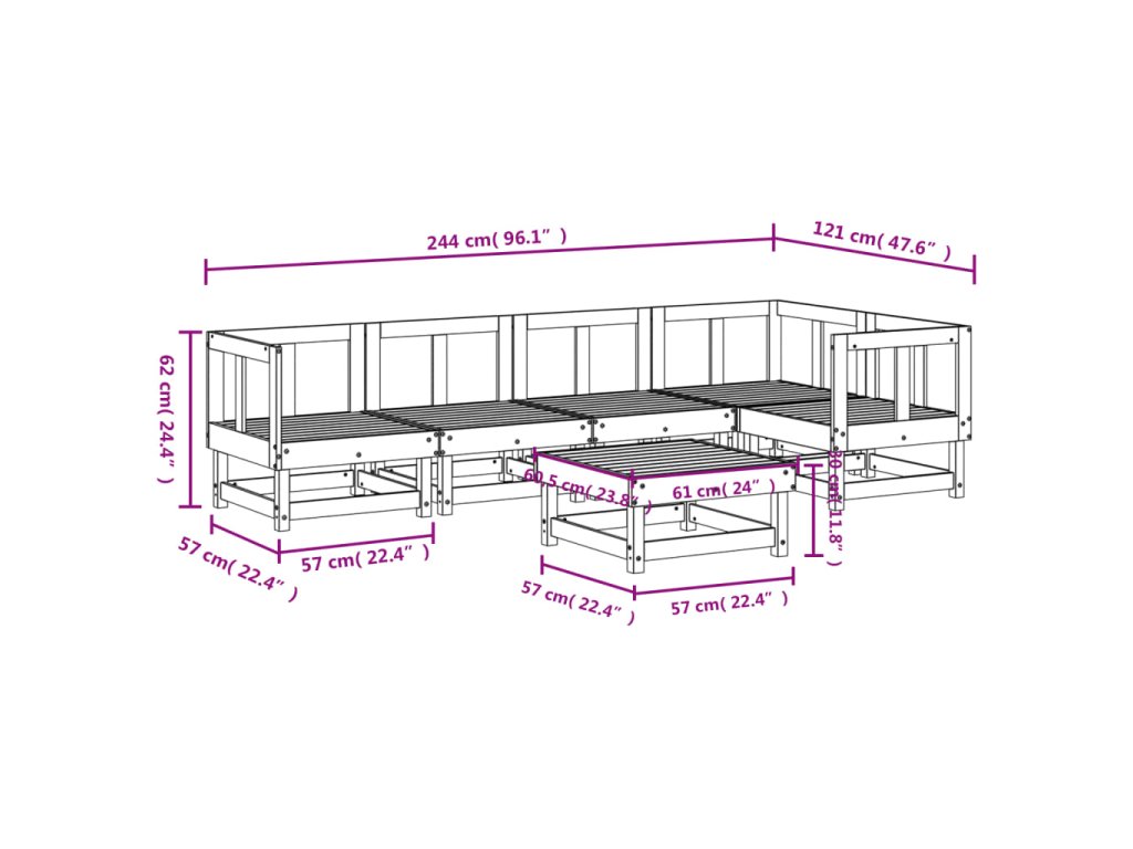- Rozměry středové pohovky: 61 x 60,5 x 62 cm (D x Š x V)