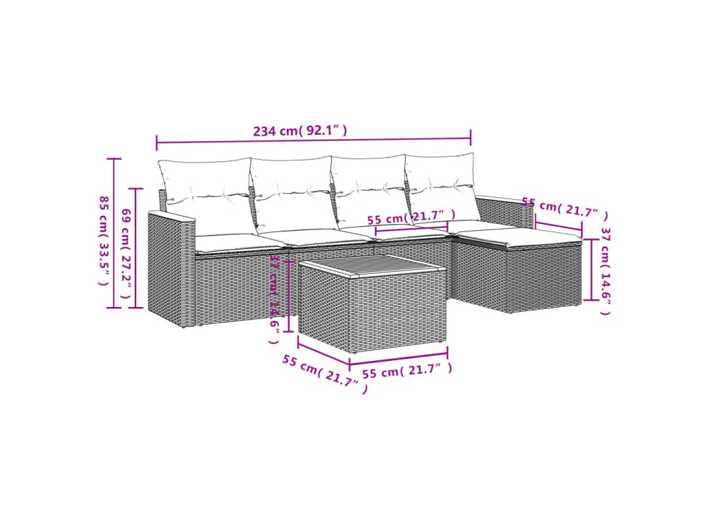 Tato zahradní sedací souprava je dokonalým doplňkem vaší zahrady, terasy nebo dvorku a poskytne vám pohodlné a příjemné místo, kde si můžete povídat s rodinou a přáteli nebo jen tak odpočívat a užívat si pobyt venku.