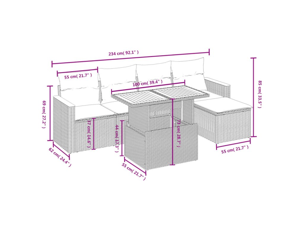 Tato zahradní sedací souprava je dokonalým doplňkem vaší zahrady, terasy nebo dvorku a poskytne vám pohodlné a příjemné místo, kde si můžete povídat s rodinou a přáteli nebo jen tak odpočívat a užívat si pobyt venku.
