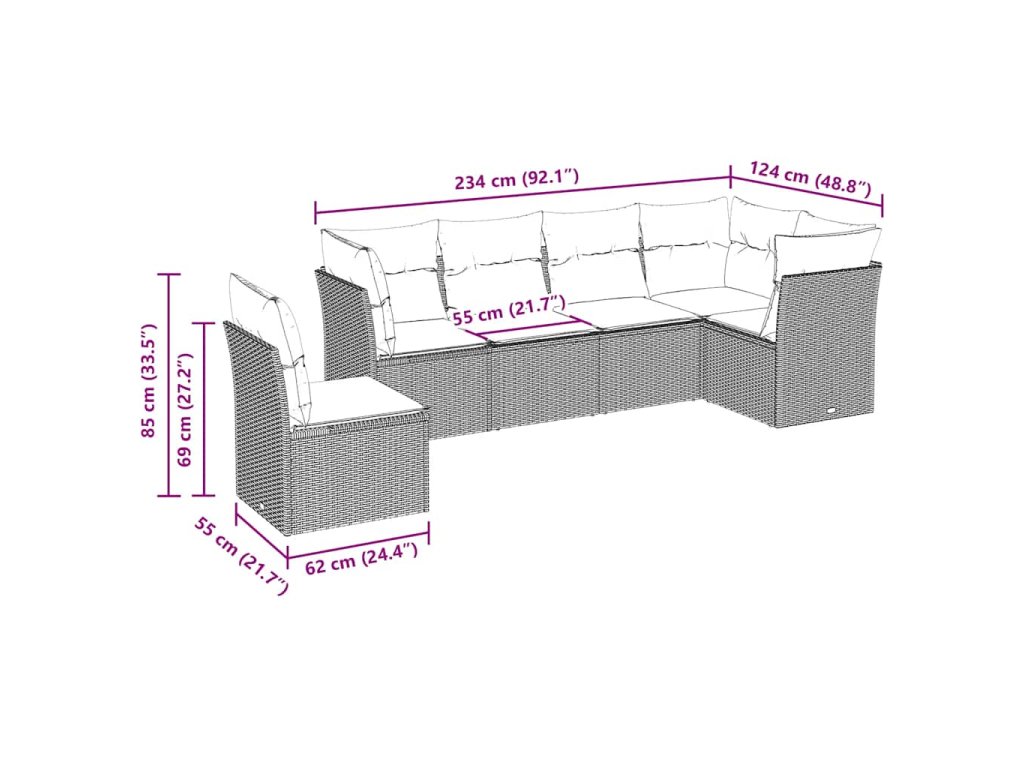 - Celkové rozměry 5místné pohovky: 234 x 124 x 69 cm (Š x H x V)