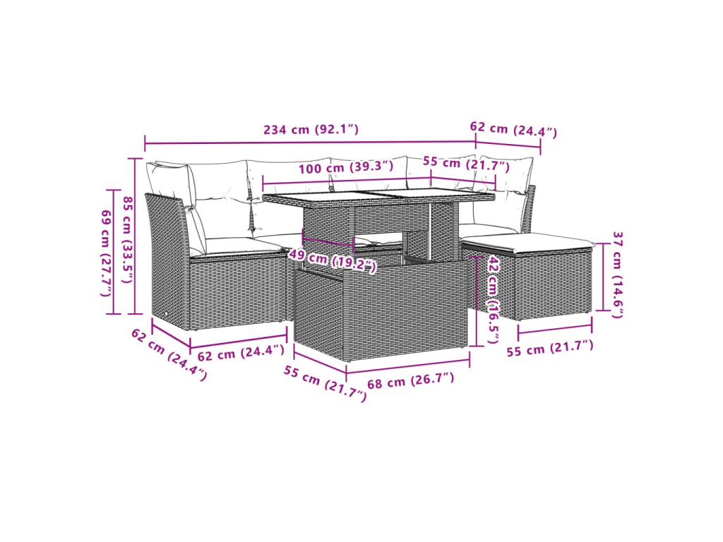 Tato zahradní sedací souprava je dokonalým doplňkem vaší zahrady, terasy nebo dvorku a poskytne vám pohodlné a příjemné místo, kde si můžete povídat s rodinou a přáteli nebo jen tak odpočívat a užívat si pobyt venku.