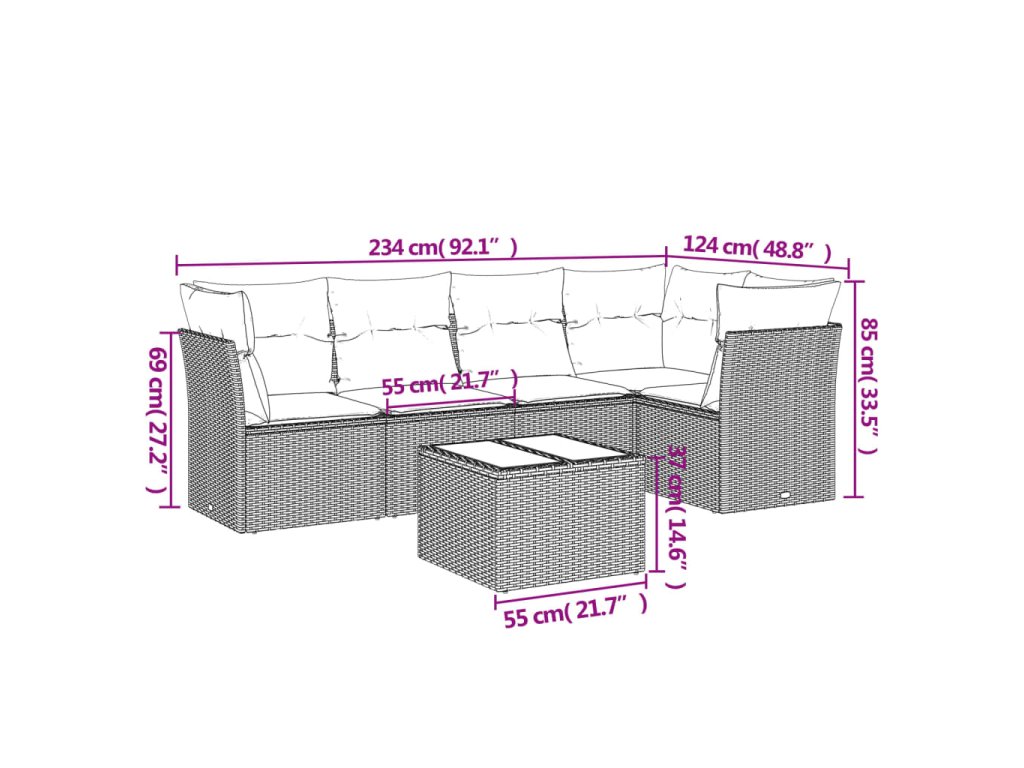 Tato zahradní sedací souprava je dokonalým doplňkem vaší zahrady, terasy nebo dvorku a poskytne vám pohodlné a příjemné místo, kde si můžete povídat s rodinou a přáteli nebo jen tak odpočívat a užívat si pobyt venku.