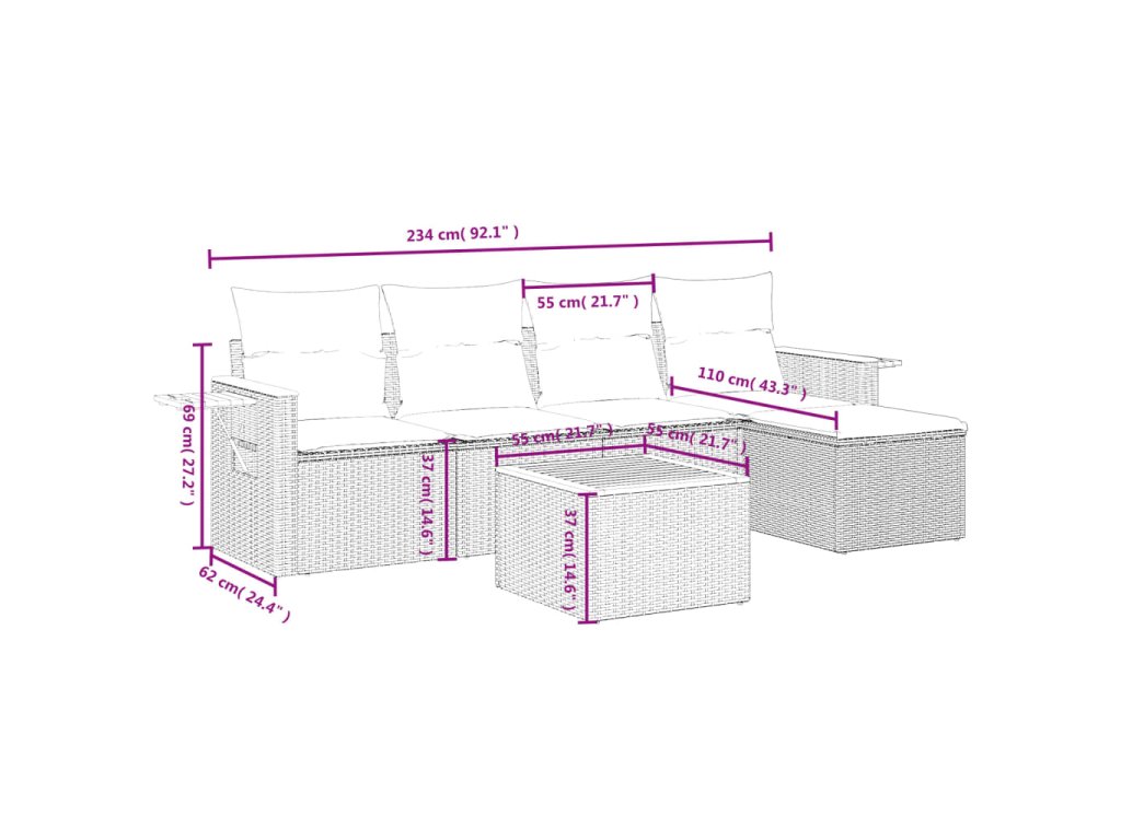 Tato zahradní sedací souprava je dokonalým doplňkem vaší zahrady, terasy nebo dvorku a poskytne vám pohodlné a příjemné místo, kde si můžete povídat s rodinou a přáteli nebo jen tak odpočívat a užívat si pobyt venku.
