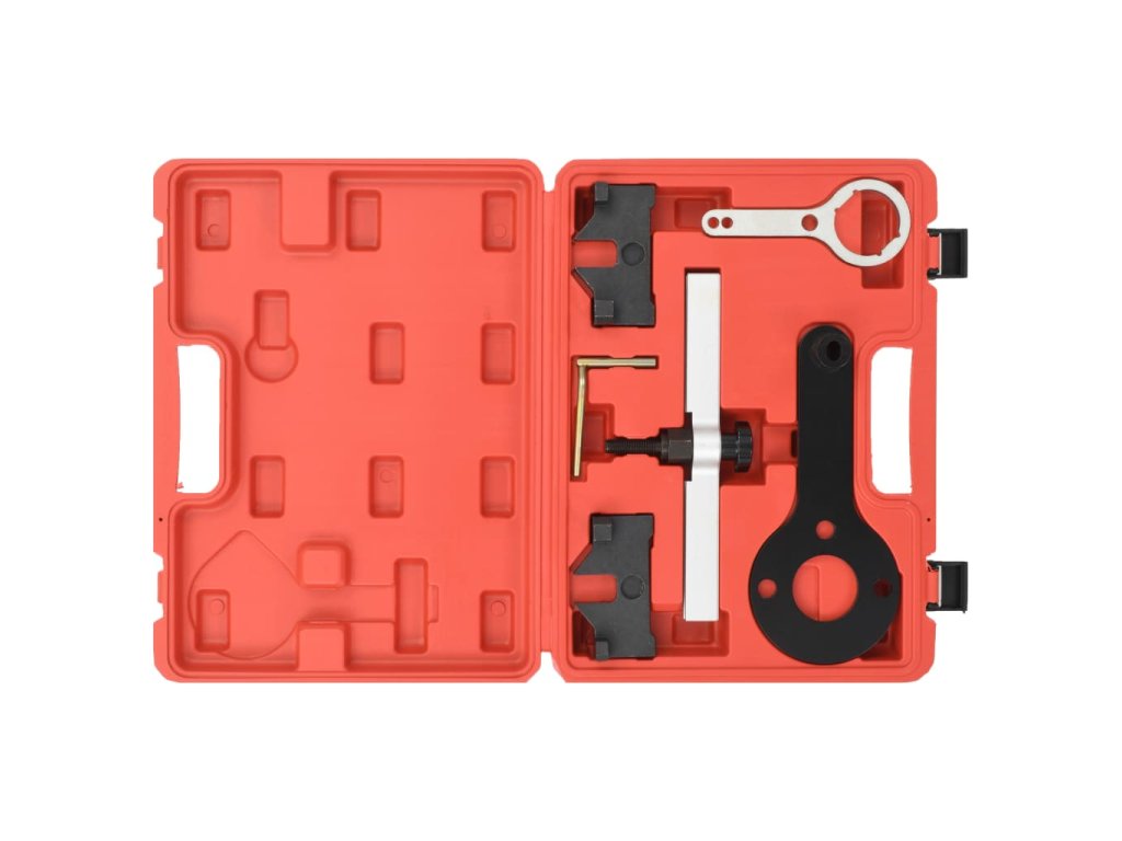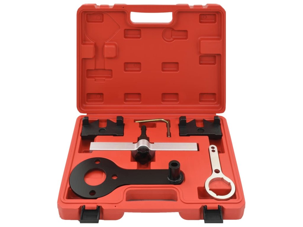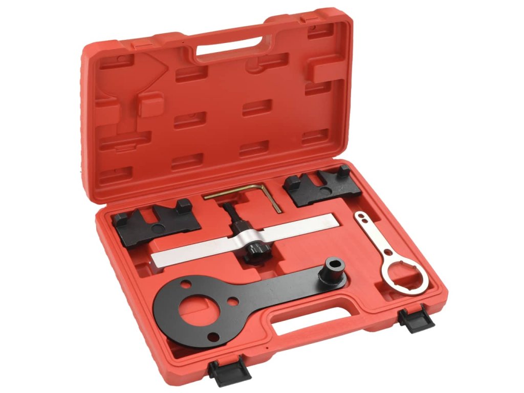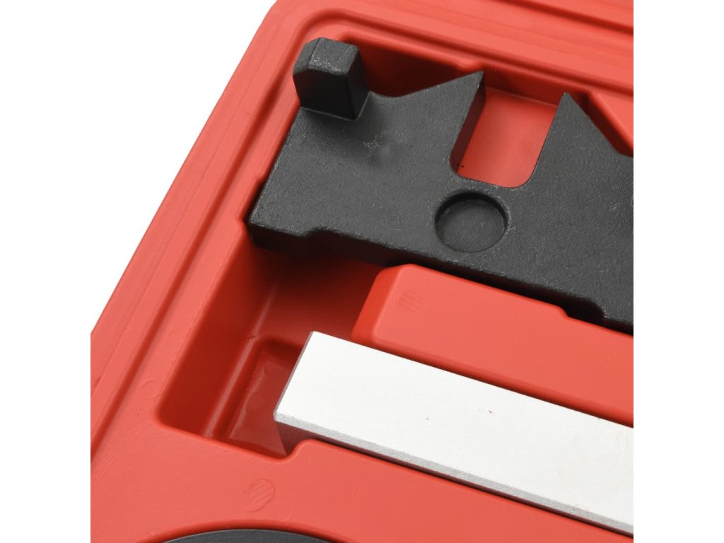 Tento set nářadí pro časování motoru je dodáván společně s 2 vyrovnávacími přípravky pro upevnění vačkového hřídele v TDC pozici během sestavení, jedním úvraťovým kolíkem pro srovnání setrvačníku do TDC pozice a 3 upínači nutnými pro upevnění systému VANOS.
