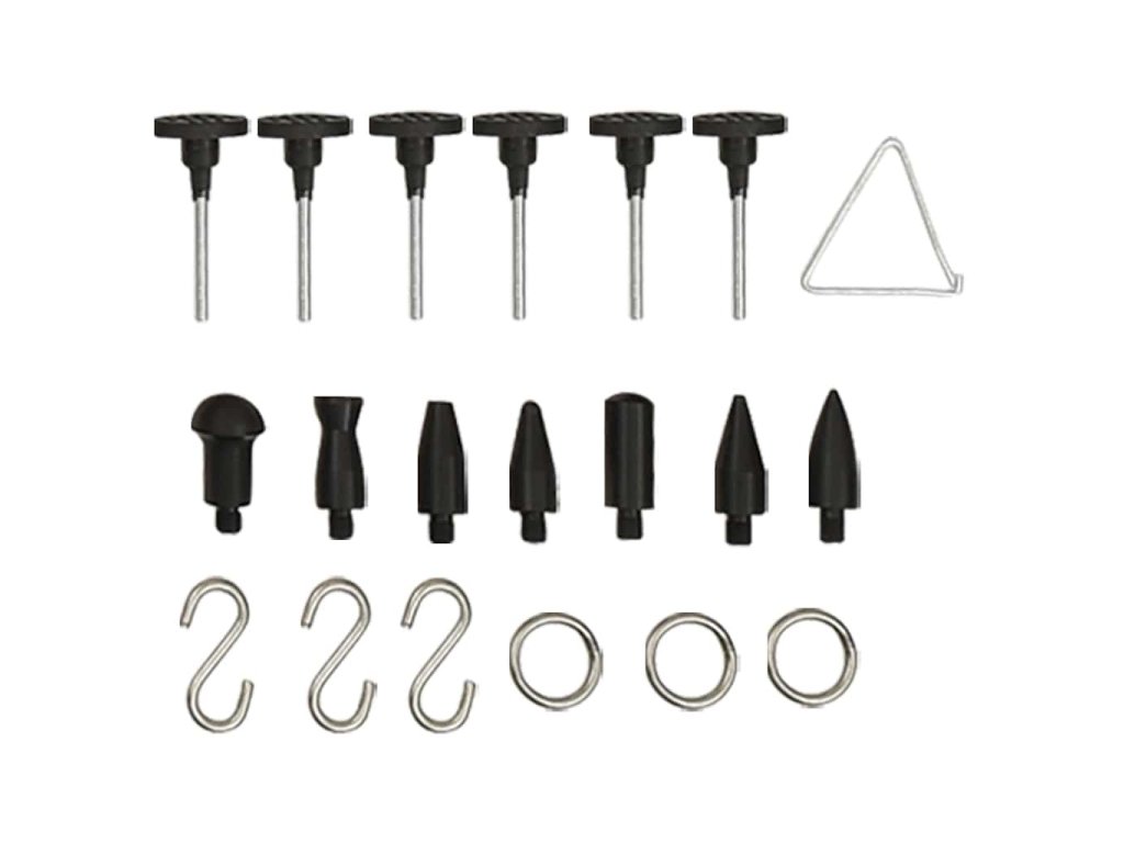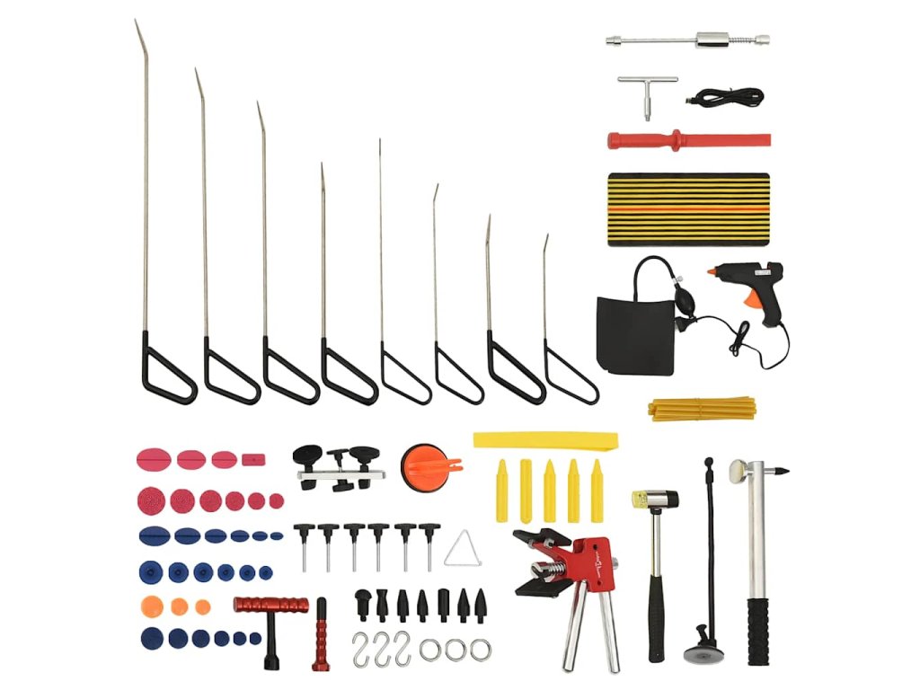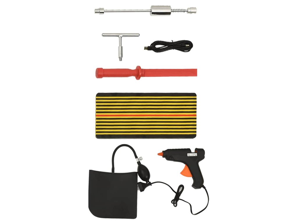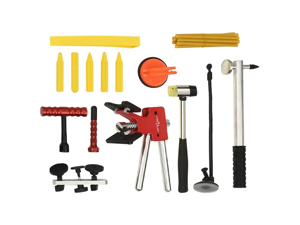 Tato sada nářadí na opravu karosérie se dodává s mnoha různými velikostmi lepících přísavek, které jsou vhodné pro většinu promáčklin a důlků od krupobití. Kladivo z nerezové oceli je efektivnější a odstraňuje velké promáčkliny. Modernizovaný příčný vytahovák je vhodný také pro opravu malých a středně velkých důlků. Tato metoda zaručuje účinné a bezpečné odstranění promáčklin, které může ochránit lak karoserie. Linkovaný kontrolní štít slouží ke kontrole promáčklin na rovném kovovém povrchu. Sada na opravu promáčklin svépomocí je nákladově nejefektivnější metodou odstraňování promáčklin na autě, promáčklin po krupobití, promáčklin na nádrži motocyklu atd.