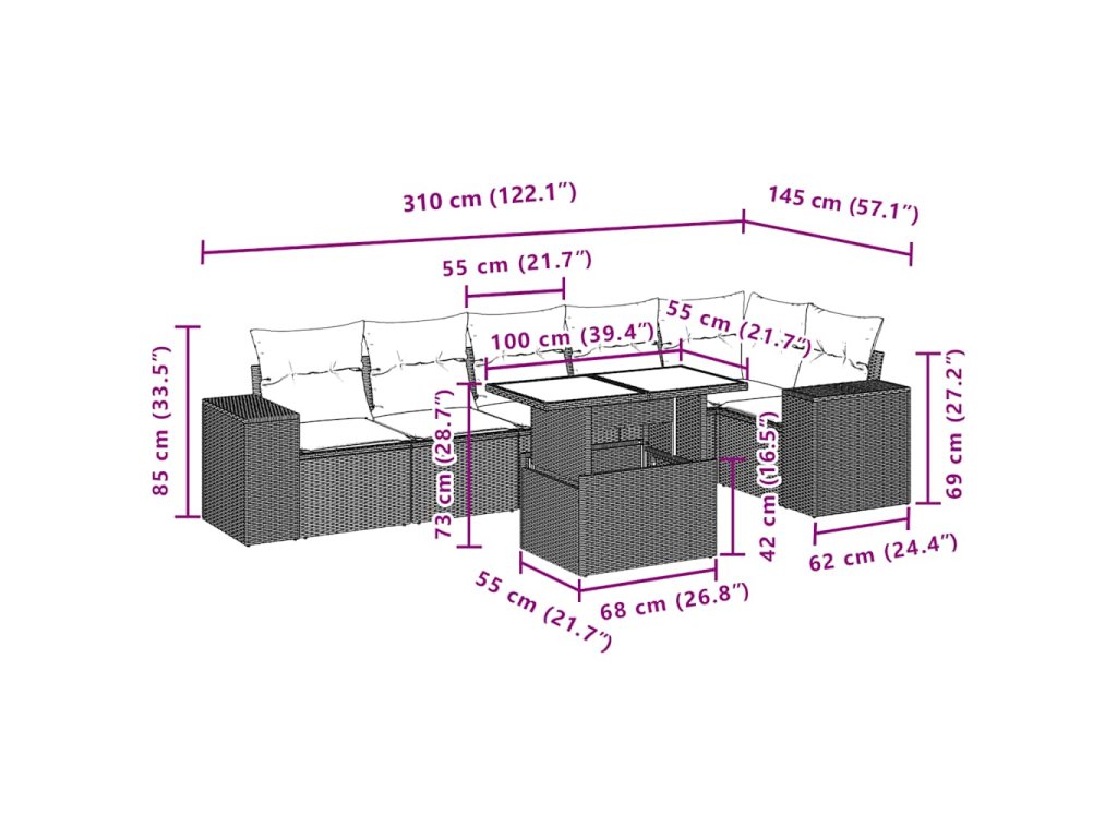Tato zahradní sedací souprava je dokonalým doplňkem vaší zahrady, terasy nebo dvorku a poskytne vám pohodlné a příjemné místo, kde si můžete povídat s rodinou a přáteli nebo jen tak odpočívat a užívat si pobyt venku.