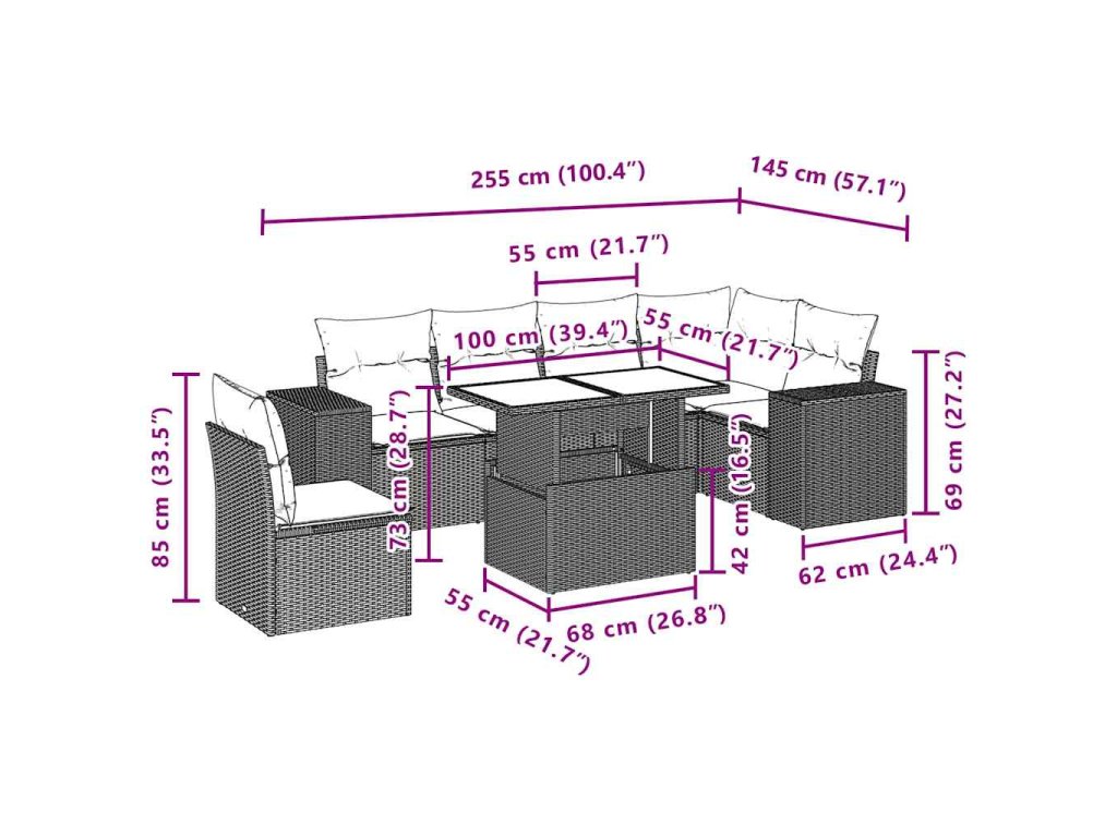 Tato zahradní sedací souprava je dokonalým doplňkem vaší zahrady, terasy nebo dvorku a poskytne vám pohodlné a příjemné místo, kde si můžete povídat s rodinou a přáteli nebo jen tak odpočívat a užívat si pobyt venku.