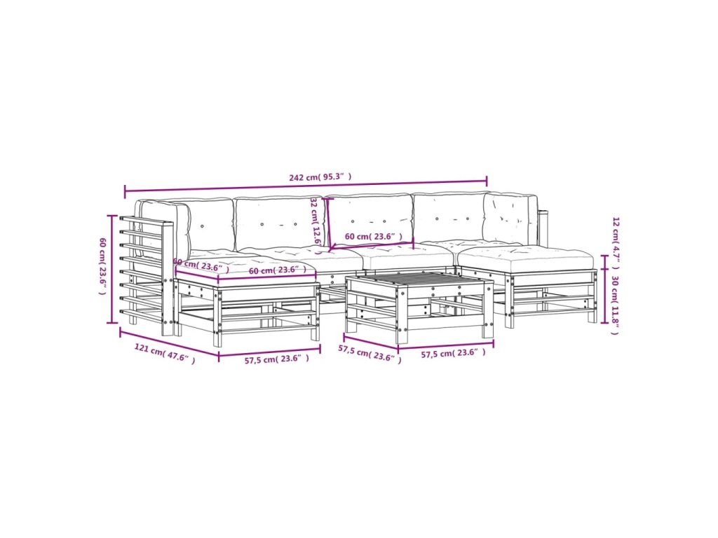 - Rozměry středové pohovky: 57,5 x 63,5 x 60 cm (D x Š x V)