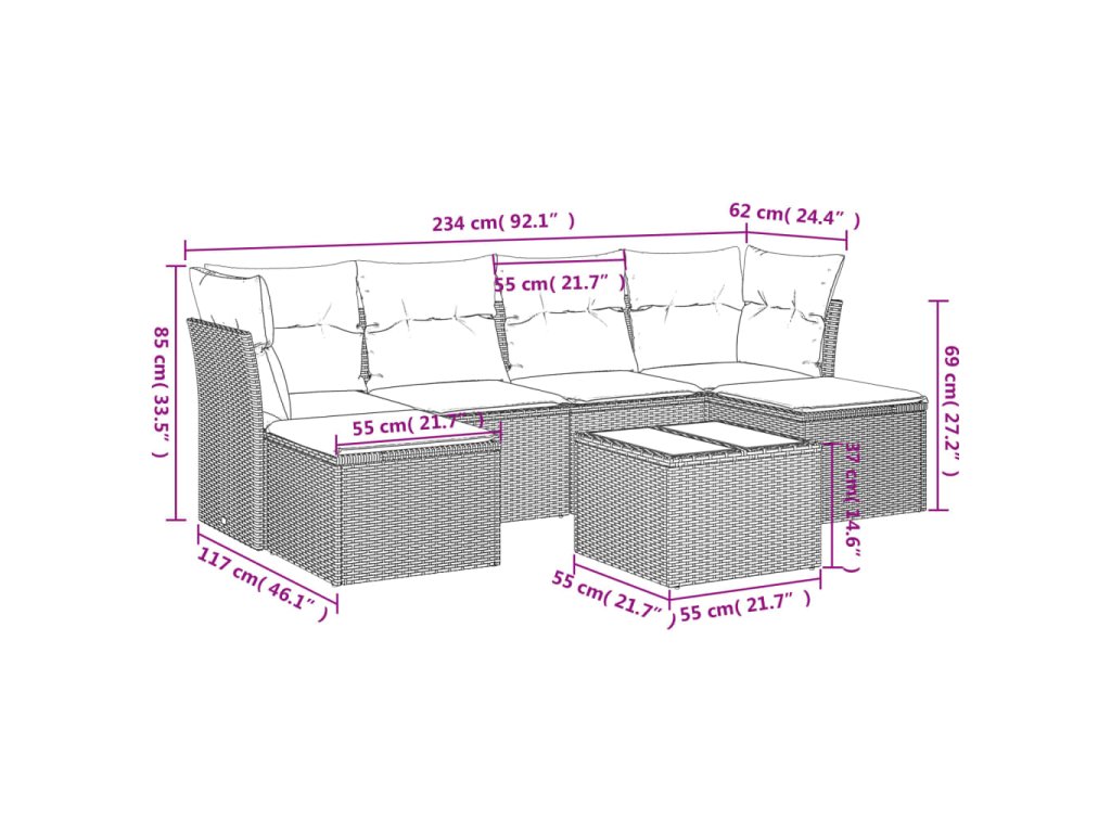Tato zahradní sedací souprava je dokonalým doplňkem vaší zahrady, terasy nebo dvorku a poskytne vám pohodlné a příjemné místo, kde si můžete povídat s rodinou a přáteli nebo jen tak odpočívat a užívat si pobyt venku.
