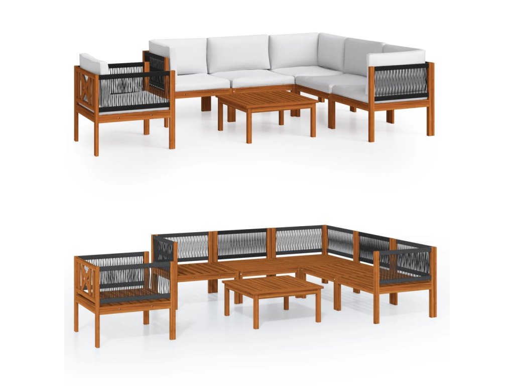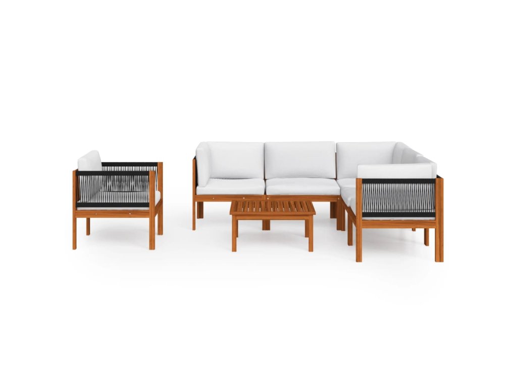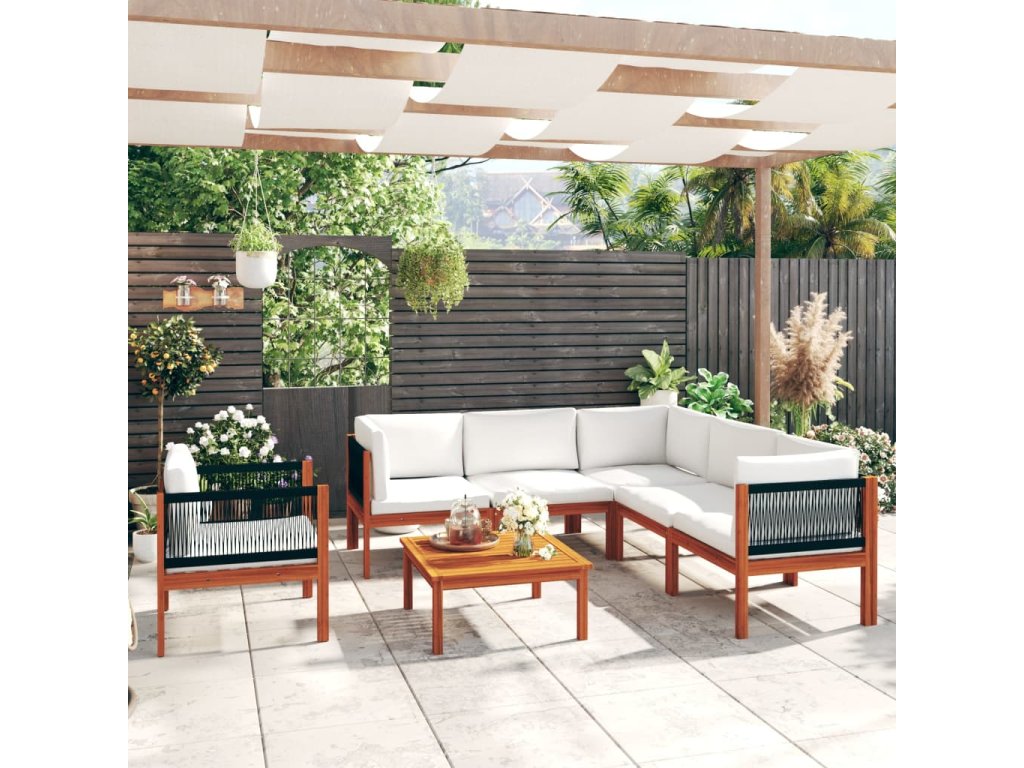 7dílná zahradní sedací souprava s polštáři krémové dřevo akácie a provaz 3057889